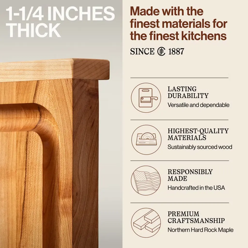 Made in our home and crafted for yours, the John Boos Countertop Collection wooden cutting board is a kitchen essential for BBQ aficionados and culinary enthusiasts. Handcrafted from high-quality wood and made in the USA, this professional cutting board is designed with a countertop lip to prevent the cutting board from sliding during chopping and slicing for a reliable cutting foundation. Featuring a substantial 1.25-inch thickness, this cutting board offers a sturdy and reliable cutting surface for all your culinary needs. The reversible board features a convenient juice groove on one side, preventing liquids from spilling onto your countertop surface and ensuring a mess-free cooking experience. This expertly crafted tool features an oil finish that enhances the natural beauty of the wood board while offering added protection against moisture and daily wear. Maintain the bevel, sand minor scratches, and follow simple maintenance solutions found in our kitchen cutting board care and usage sheet to ensure longevity and optimal performance. For additional care, we recommend using our Boos Block Mystery Oil and Board Cream (sold separately) to revitalize and protect the wood fibers and wooden surface. Since 1887, John Boos & Co. products have been the choice for renowned chefs and restaurateurs worldwide. Through a legacy of workmanship, innovation, and devotion stemming from our founder to employees past and present, John Boos & Co. aspires to be recognized worldwide as a touchstone at the heart of cooking and the enjoyment of food.