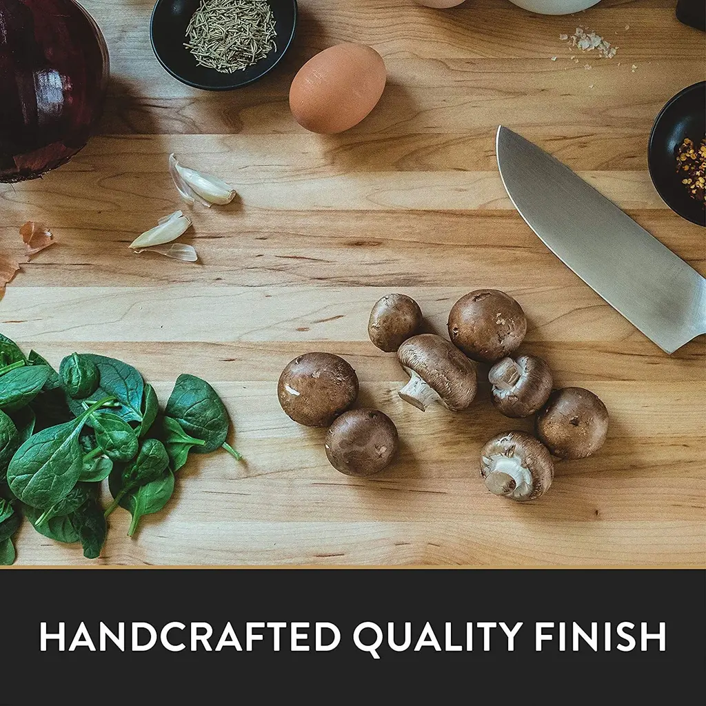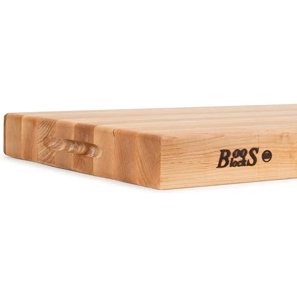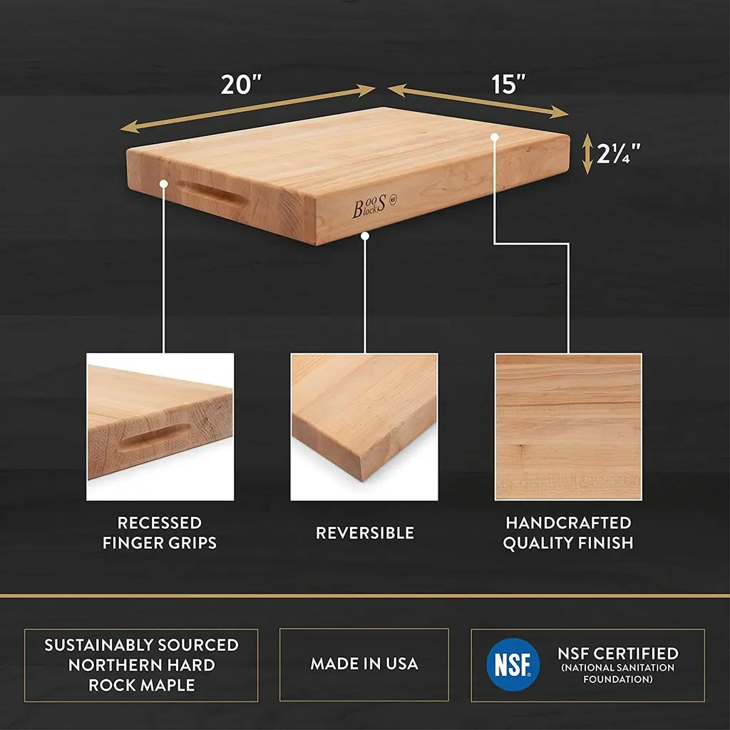 The best way to the heart is through the stomach. Create delicious appetizers, snacks, and meals for your next family get-together with John Boos 20-Inch Wide Cutting Board. This must-have versatile food prep tool is perfect for chopping meats, fruits, veggies, and more. Save time preparing multiple snacks and use this large wooden cutting board to prepare yummy treats. Take advantage of the reversible design with the 2 flat sides for cutting, carving, and chopping bread, veggies, and other ingredients. The integrated hand grips on each side make the board easy to lift, flip, and maneuver. Crafted from durable and sustainably sourced, hand-selected hard maple wood, the solid construction is suitable for indoor or outdoor use. After you're finished using John Boos Cutting Board, easily wash by hand. Occasionally use Boos Oil (sold separately) to help maintain the impressive grain and natural golden coloration. Must-have food preparation accessory perfect for chopping meats, fruits, and veggies Reversible board features 2 completely flat sides that can be used as cutting surfaces Integrated hand grips on each side make the board easy to lift, flip, and maneuver Crafted from durable and sustainably sourced, hand-selected hard maple wood Versatile design and solid construction suitable for indoor cooking or outdoor grilling Effective resistant to moisture makes this board perfect for culinary applications and serveware Impressive grain and natural golden coloration Low maintenance care only requires quick hand washing Occasional use of Boos Oil provides an additional barrier that forces bacterial fluids to bead up and, and reduces interaction with the board (not included) Do not soak, put in the dishwasher, microwave, or refrigerator Thickness: 2.25 inches Color: Natural Dimensions (L x W x H): 20 x 15 x 2.25 inches Weight: 20 pounds Manufacturer warranty: 1-year warranty