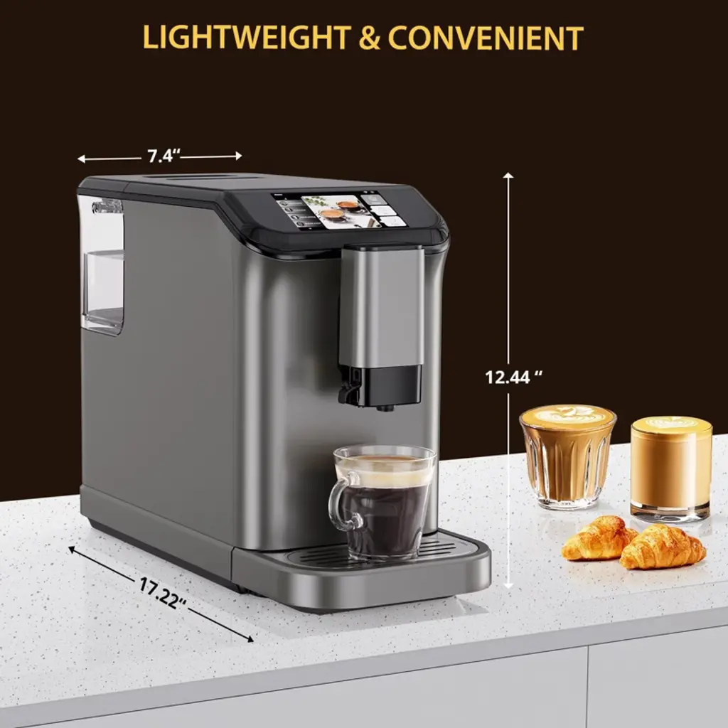 Brew like a barista with the Super Automatic 20 Bar Espresso Machine. Designed with a built-in burr grinder, adjustable grind settings, and a professional steam wand, this all-in-one coffee maker delivers rich espresso, creamy lattes, and frothy cappuccinos at the touch of a button. The TFT touchscreen offers 7 customizable drink options, while the compact stainless steel design makes it a stylish and functional addition to any kitchen.