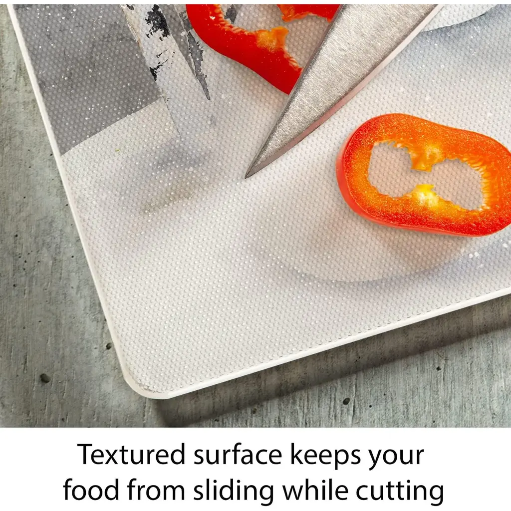 This stunning design features a slimline, stainless steel case that keeps four large, food-specific cutting boards beautifully organized and makes a real statement on the counter. Each color-coded board has a knife-friendly, textured cutting surface on both sides, non-slip feet and icons indicating which food type they should be used for - raw meat, raw fish, vegetables or cooked food. They can be easily removed from the case, due to the smart angled design, and are held neatly apart allowing air to circulate. The case features a fingerprint-proof coating to make cleaning easy and non-slip feet on the base.