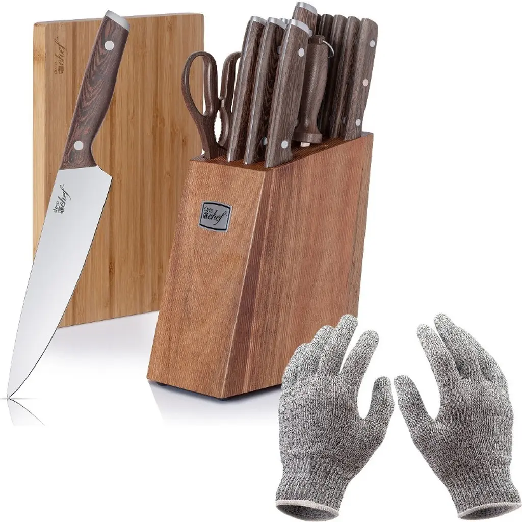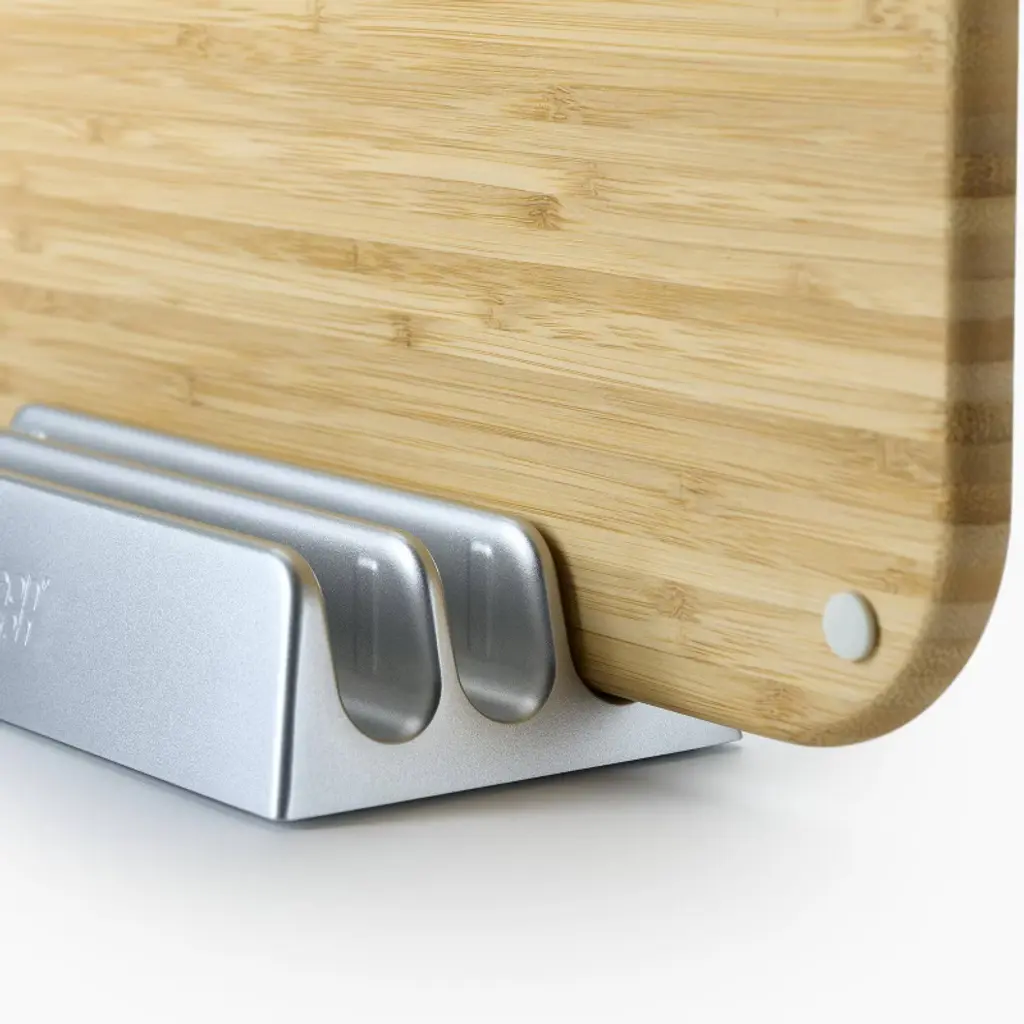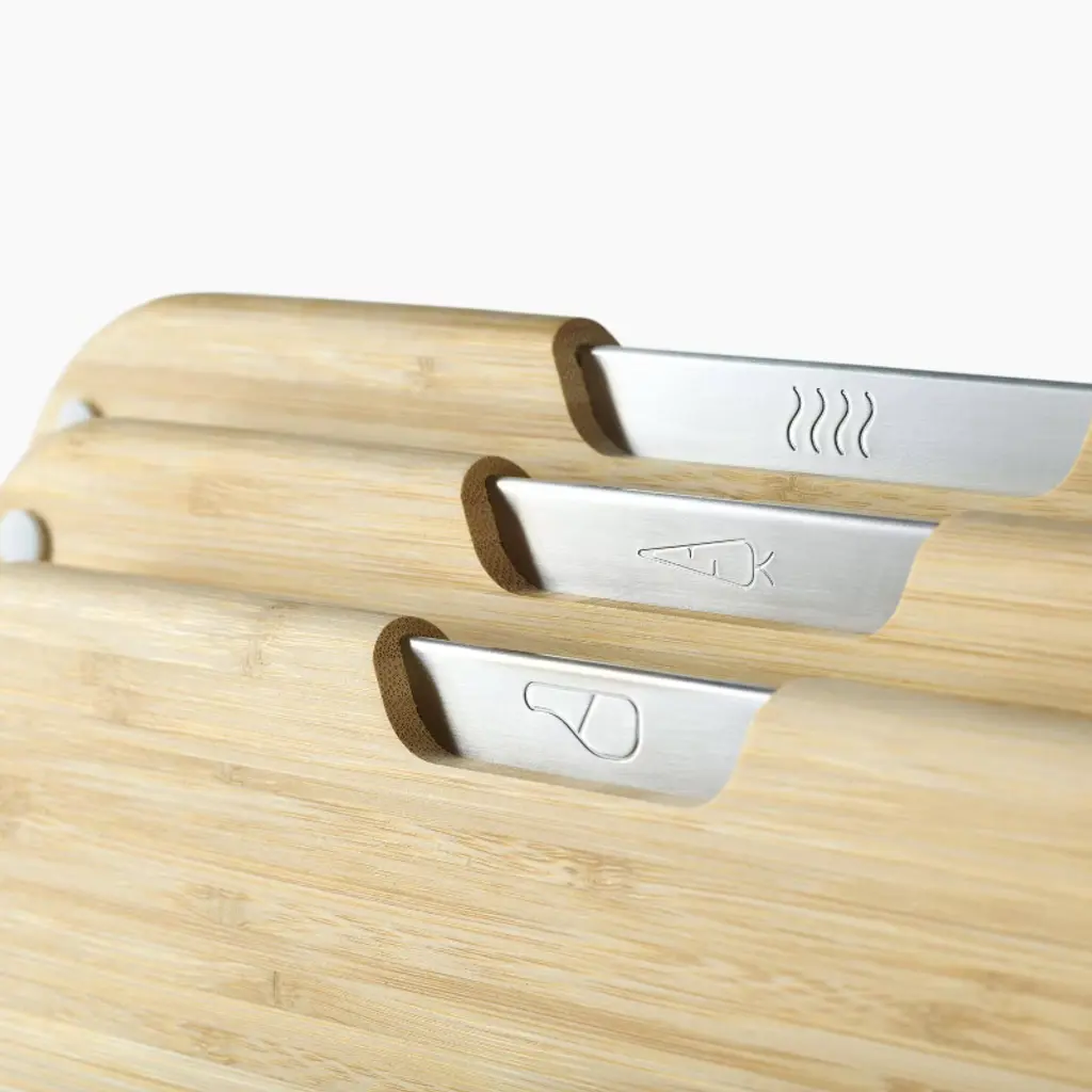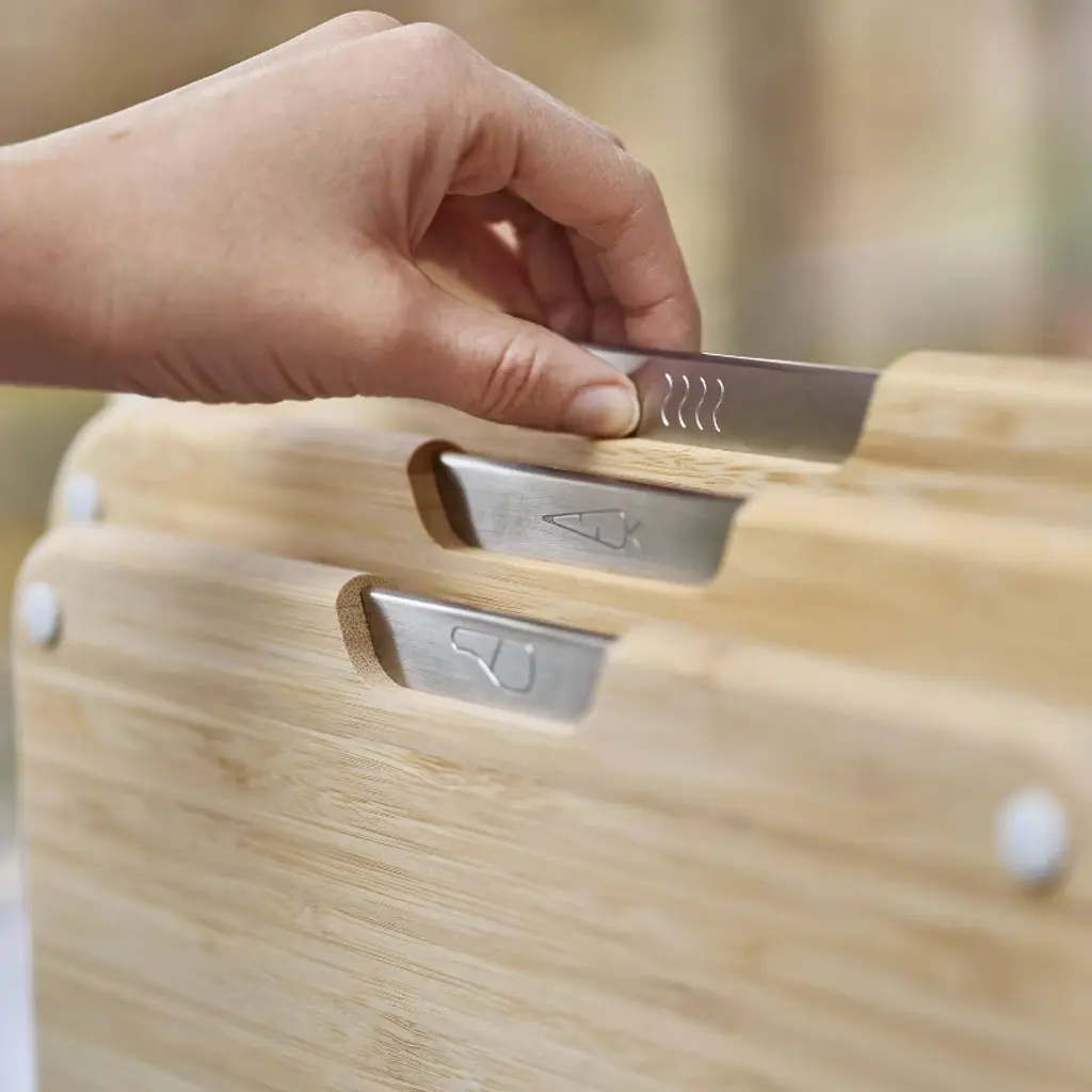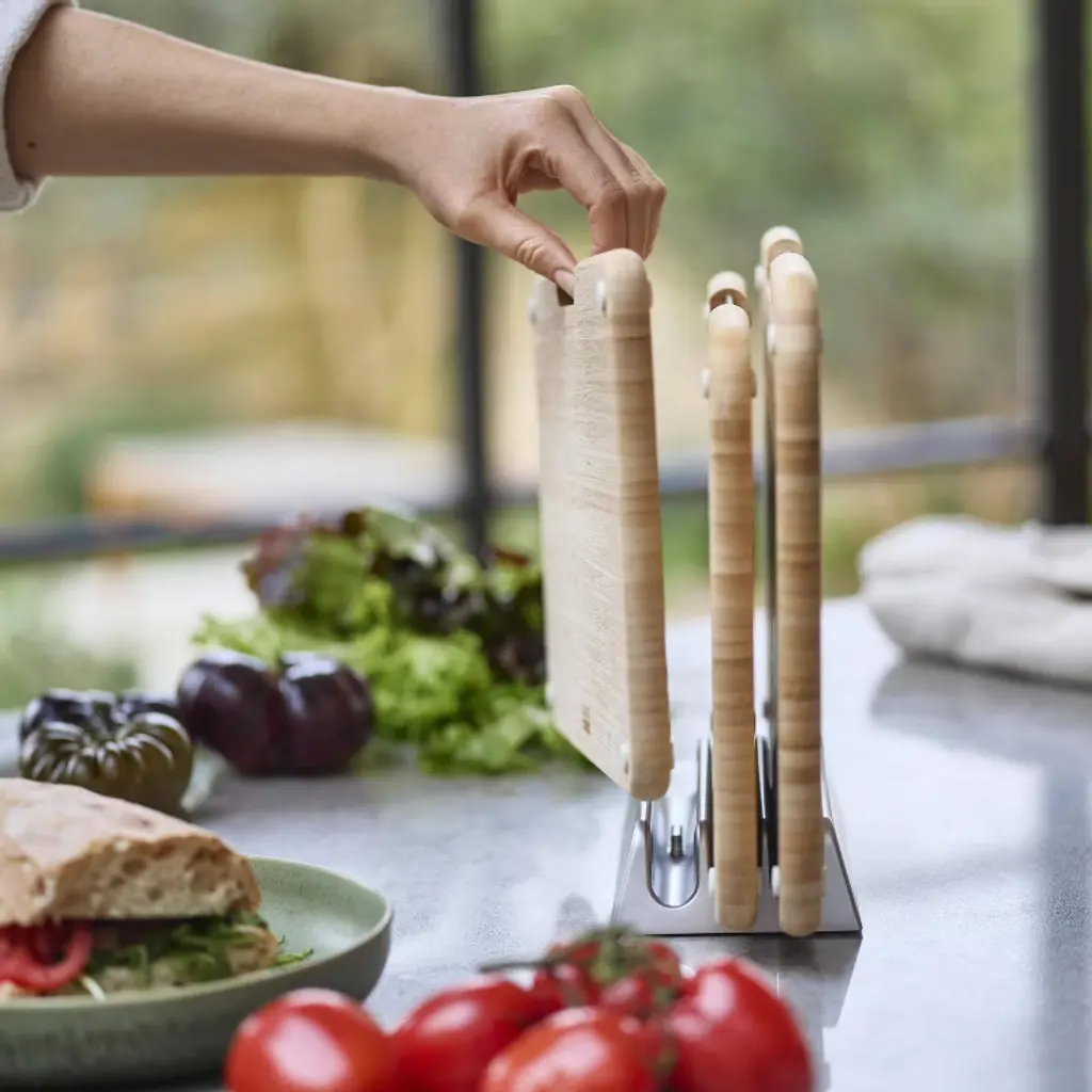 This smart cutting board set comes with three tough, double-sided bamboo boards and a compact metal storage stand with secure metal slots. To help prevent cross-contamination, each of the non-slip boards come with food-specific icons for preparing raw meat, vegetables and cooked food separately. Additionally, the metal storage stands keeps them in one useful place, and the stainless-steel tabs make each board easy-to- access. When stored, the metal stand holds the boards apart to ensure air circulation for hygienic drying.