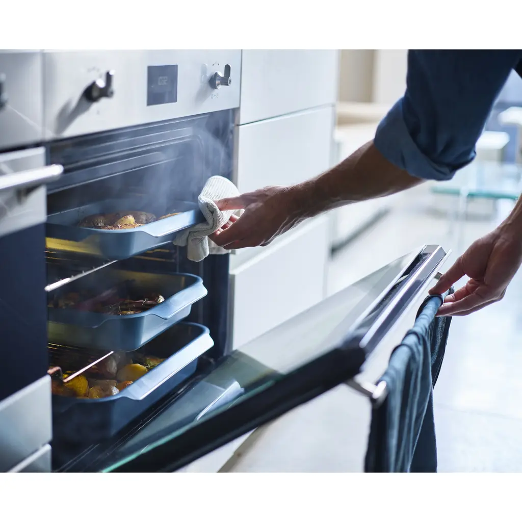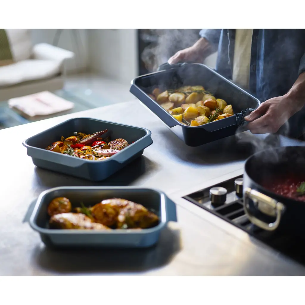 This stylish, 16" non-stick roasting pan features easy-pull handles on all sides. They provide a large gripping point and make removing and handling the tray safe and easy. Made from high-quality carbon steel with a durable, non-stick coating, it's perfect for roasting a wide variety of foods. When stored with other Nest Oven pans, the clever stacking design keeps everything neatly organized and saves valuable drawer space.
