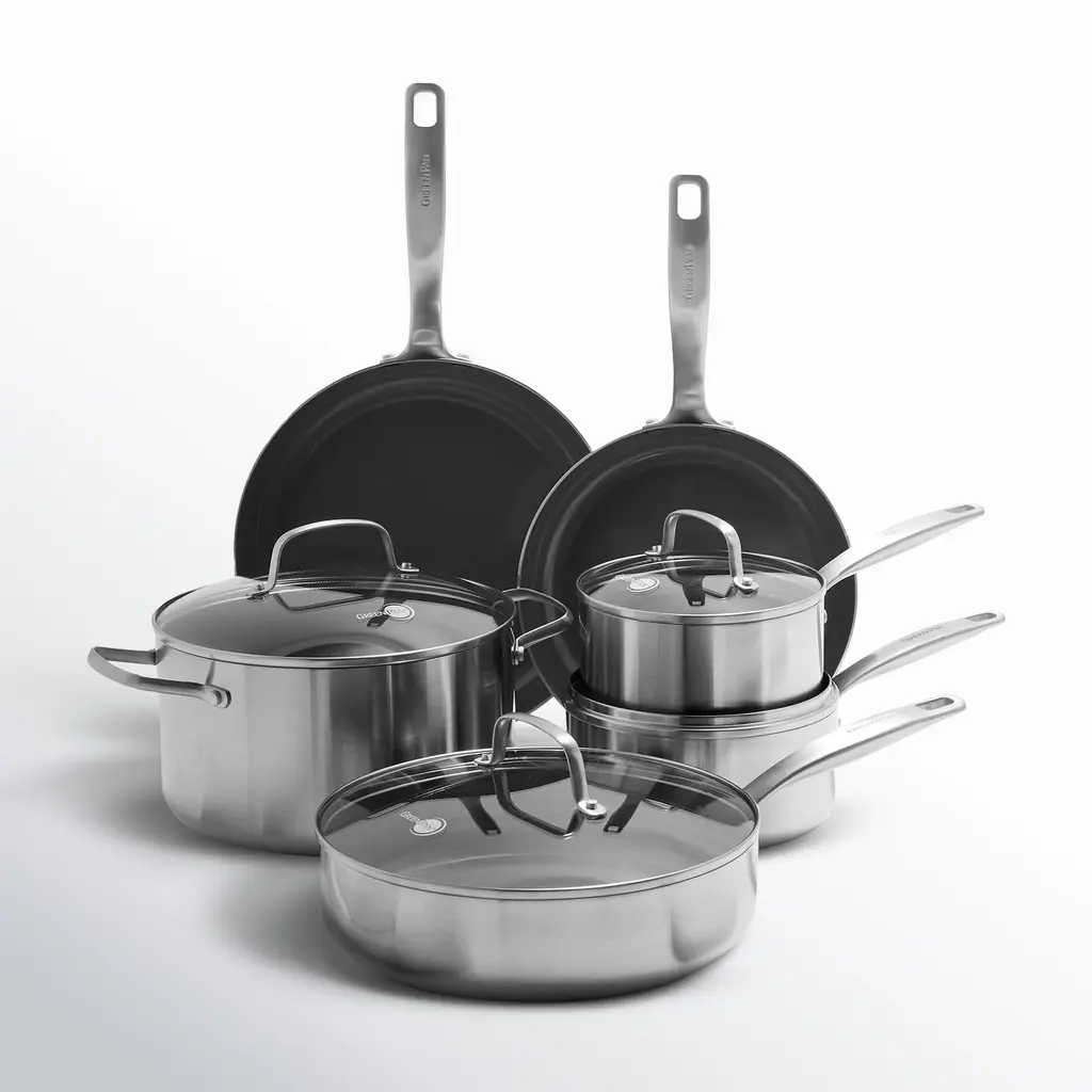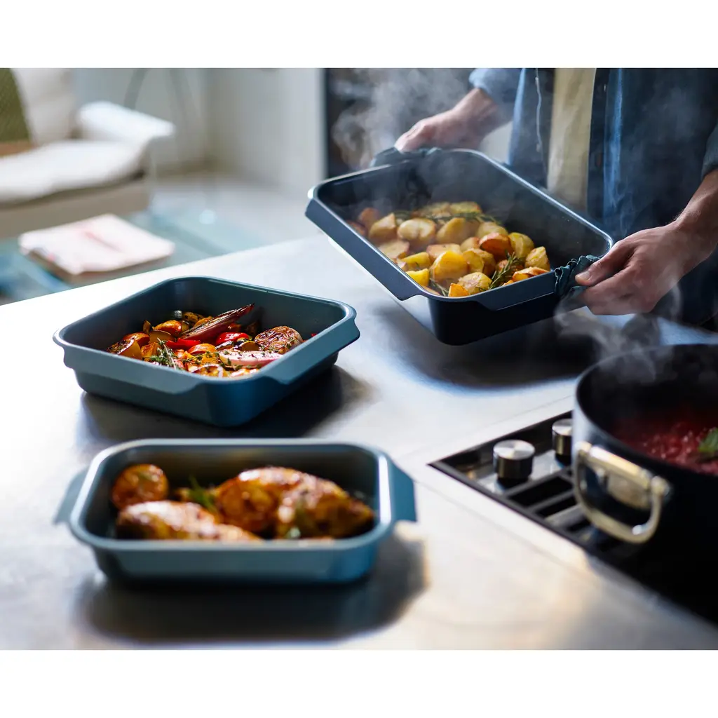 This stylish set of non-stick roasting pans feature easy-pull handles on all sides. They provide a large gripping point and make removing and handling the trays safe and easy. Made from high-quality carbon steel with a durable, non-stick coating, they're perfect for roasting all kinds of foods. When stored, the clever, stacking design keeps the three trays neatly organized and saves valuable drawer space.Includes: