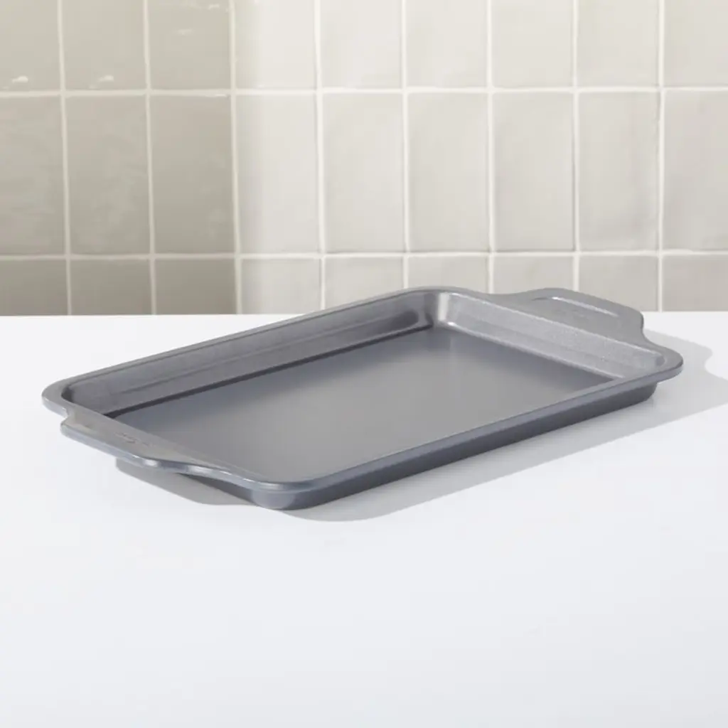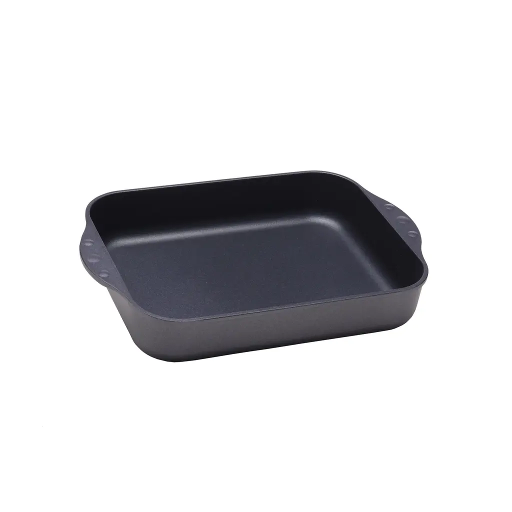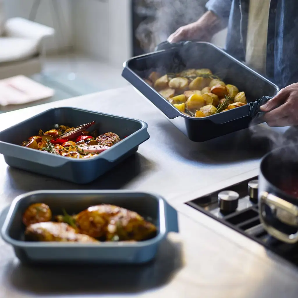 This stylish, non-stick roasting pan feature easy-pull handles on all sides. Designed for oven gloves, they provide a large gripping point and make removing and handling the tray safe and easy. Made from high- quality carbon steel with a duarable, non-stick coating, it's perfect for roasting a wide variety of foods. When stored with other Nest Oven trays, the clever, stacking design keeps everything neatly organized and saves valuable drawer space. Comes with a 10-year guarantee.