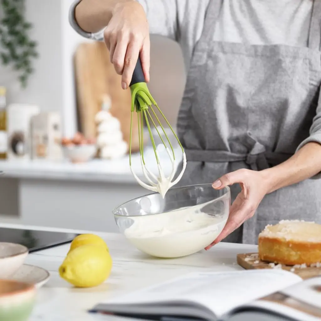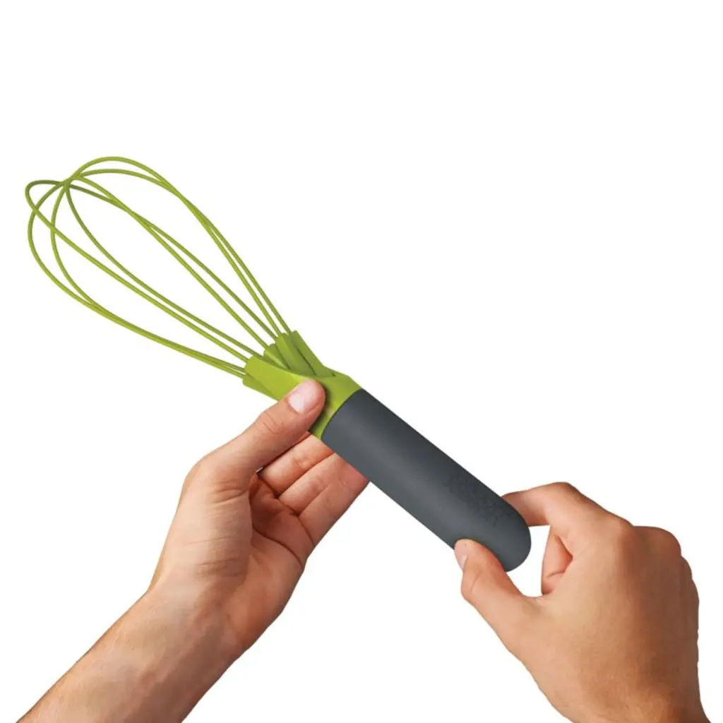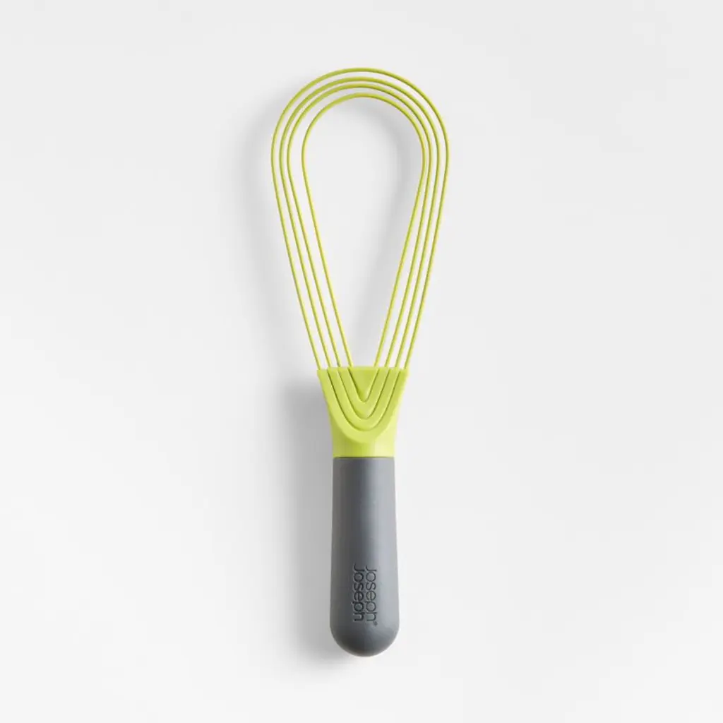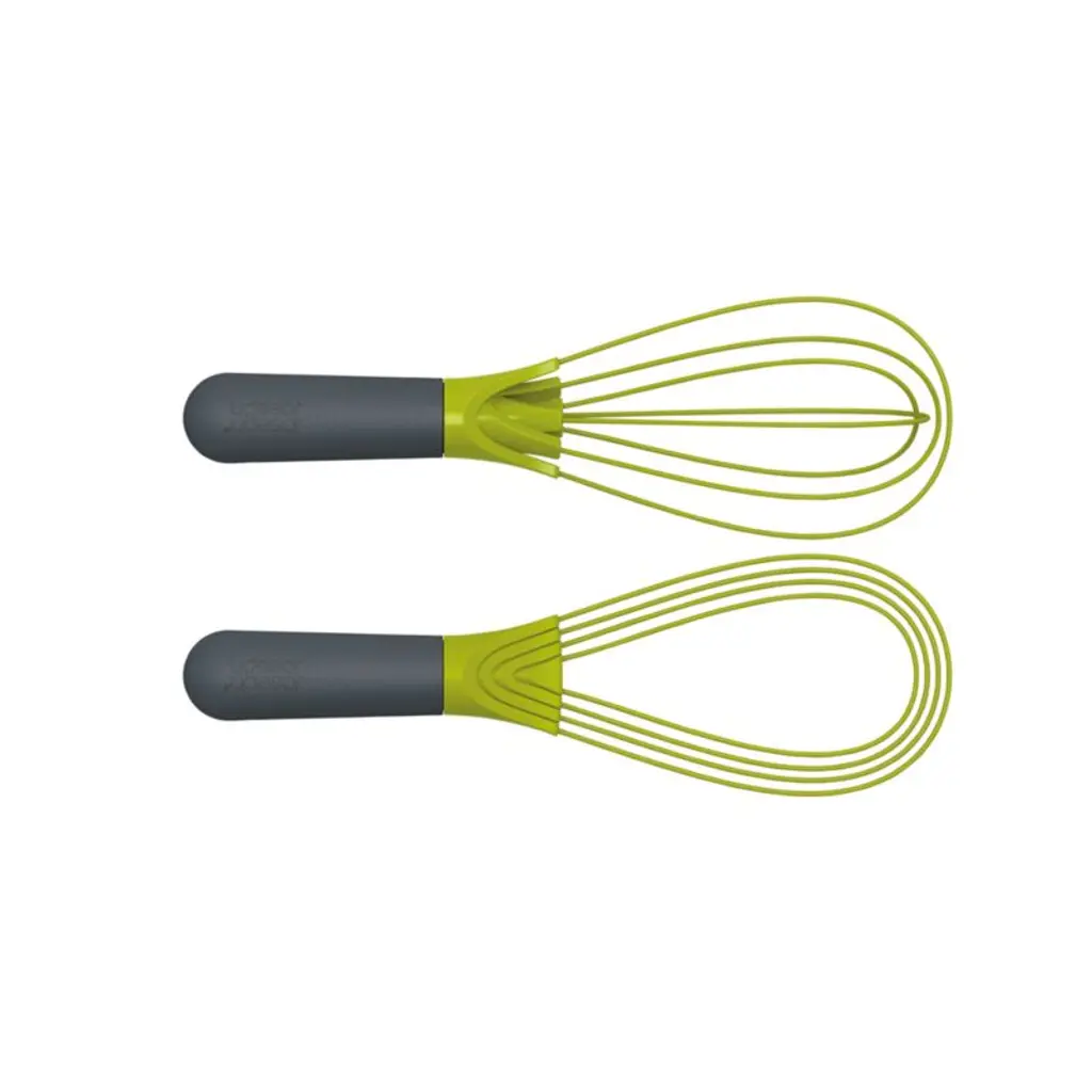 Two essential utensils in one, this ingenious whisk offers multiple mixing options. In its closed position, the black and green flat whisk stirs gravies, roux and other sauces. Or open it into a balloon whisk ideal for whipping cream, egg whites and meringue. Constructed with a sturdy handle and silicone-coated stainless steel wires that stand up to heat and won't scratch non-stick cookware, this dishwasher-safe whisk folds flat with a twist of the handle for compact storage.