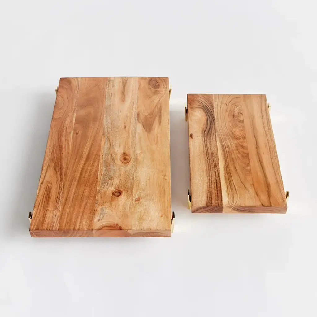 This set of acacia wood serving boards adds a warm, elegant look. Set on iron, gold finished stands, they lift your accoutrements up just slightly. Easily hand-washable and ready to set out for your next gathering.
