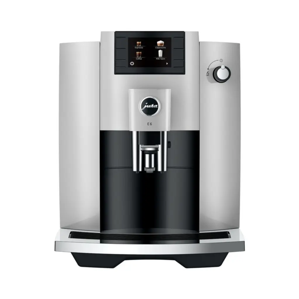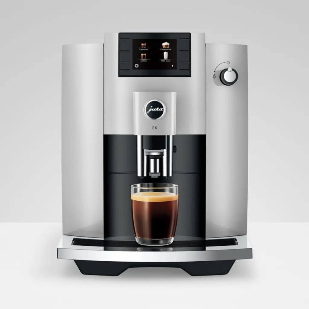 JURA's E line of espresso machines delivers cafe results right in your own kitchen. Having perfected the espresso brewing process, the E6 espresso coffee maker optimizes extraction time with its signature Pulse Extraction Process. After grinding the coffee beans for utmost freshness, the espresso machine delivers hot water through the grounds at short intervals, a process that allows the coffee flavors to develop fully. Fully programmable for water and milk amount, coffee strength and brewing temperature, the machine includes 11 individually programmed coffee drinks with additional options such as an extra shot. Buttons on the front of the platinum machine and a modern color display make operation incredibly simple. JURA brings sophistication, quality, versatility and ease of use to brewing espresso-based beverages at home.Based in Switzerland, JURA has been creating inventive, high-end appliances since 1931 and has specialized in coffee and espresso machines since the 1980s.Need help choosing? View our JURA comparison chart.