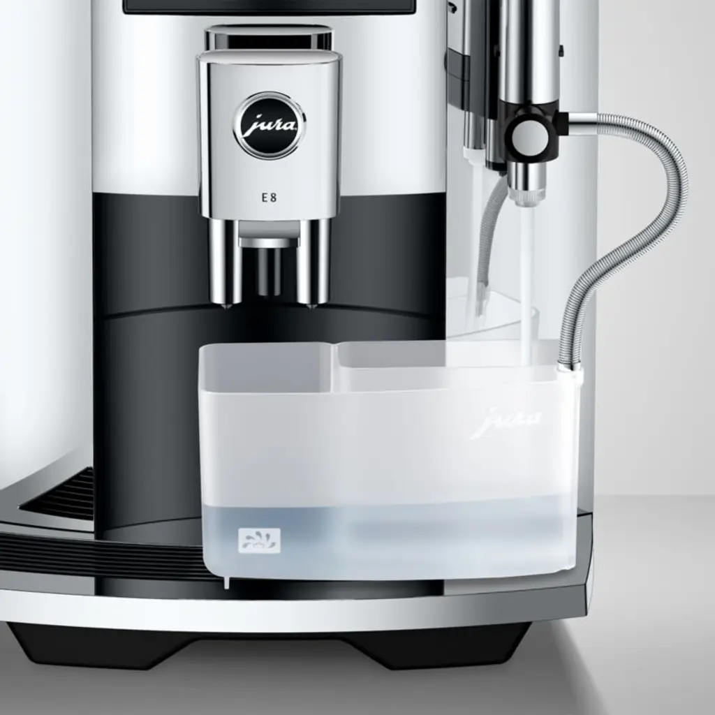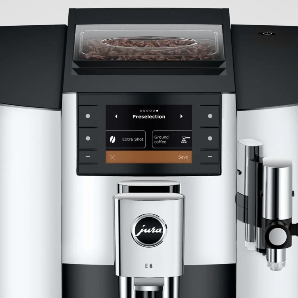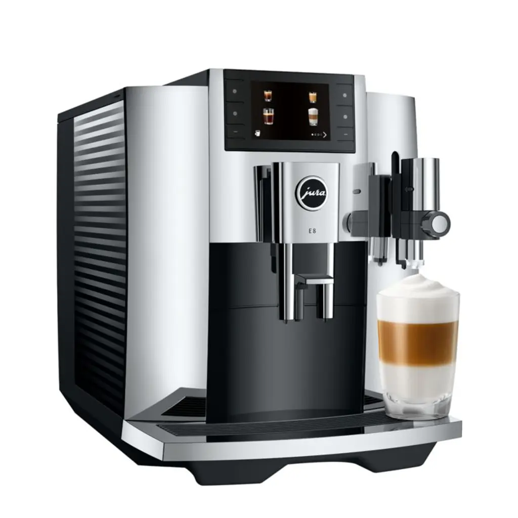 Now better than ever, the Jura E8 espresso machine is incredibly easy to use, combining state-of-the-art technology with a sleek modern design for delicious coffee. Prepare 17 coffee classics and specialty drinks at the push of a button for the same high quality you'd expect from a fine coffee bar. Thanks to the integrated coffee grinder, beans are always freshly ground, while an advanced brewing system ensures optimal extraction. It's simple to choose your favorite coffee drink with an enlarged and easy-to-use push-button display. To tailor Americanos to your liking there's a dedicated waterspout as part of the optimized fluid system. For those who like a more intense brew, the Extra Shot peps up cappuccinos or lattes. There's even one-touch cleaning of the milk system to keep your E8 primed and ready for your next coffee drink. Available in sleek chrome, this top-notch espresso machine delivers professional results for the home barista.Based in Switzerland, JURA has been creating inventive, high-end appliances since 1931 and has specialized in coffee and espresso machines since the 1980s.Need help choosing? View our JURA comparison chart.