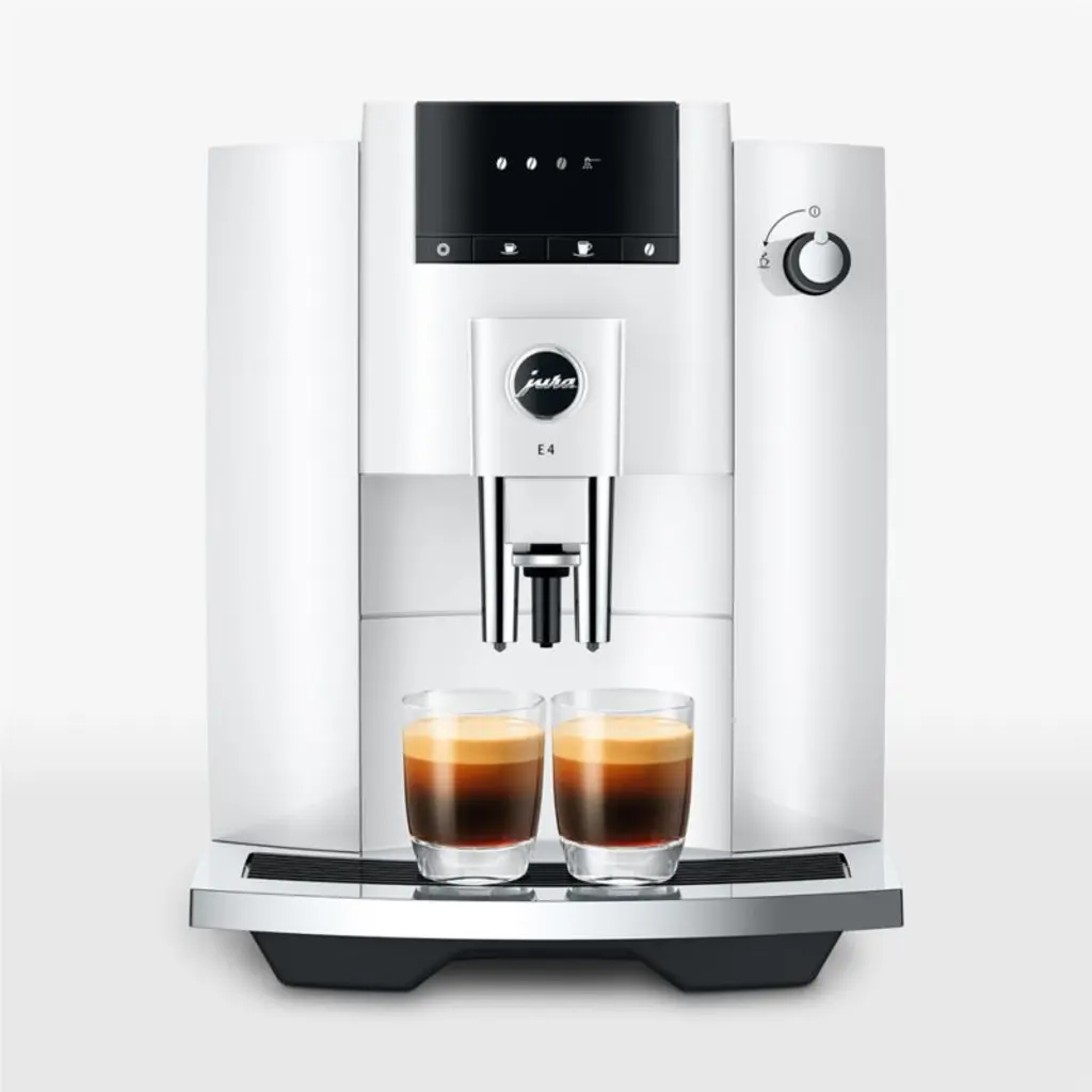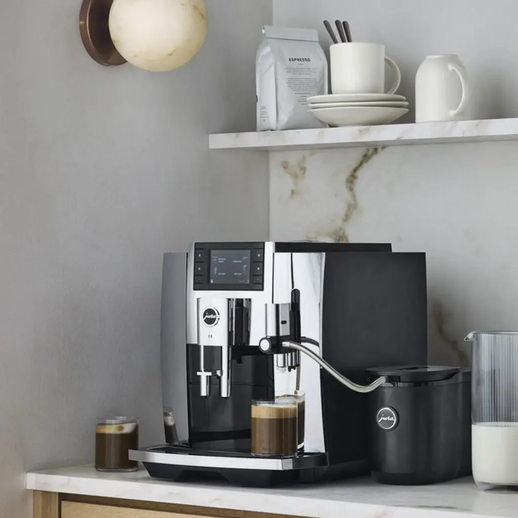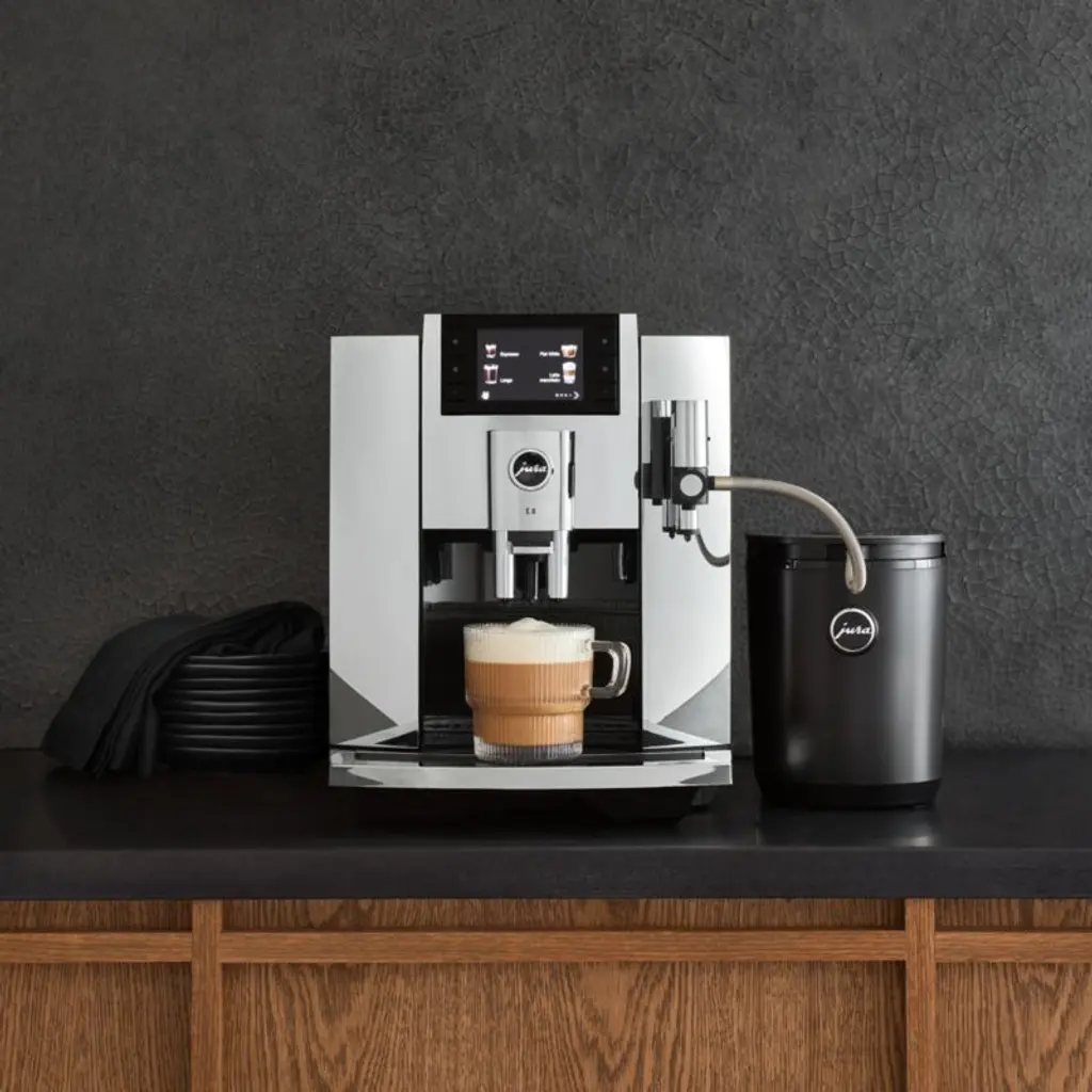 Now better than ever, the Jura E8 espresso machine is incredibly easy to use, combining state-of-the-art technology with a sleek modern design for delicious coffee. Prepare 17 coffee classics and specialty drinks at the push of a button for the same high quality you'd expect from a fine coffee bar. Thanks to the integrated coffee grinder, beans are always freshly ground, while an advanced brewing system ensures optimal extraction. It's simple to choose your favorite coffee drink with an enlarged and easy-to-use push-button display. To tailor Americanos to your liking there's a dedicated waterspout as part of the optimized fluid system. For those who like a more intense brew, the Extra Shot peps up cappuccinos or lattes. There's even one-touch cleaning of the milk system to keep your E8 primed and ready for your next coffee drink. Available in sleek chrome, this top-notch espresso machine delivers professional results for the home barista.Based in Switzerland, JURA has been creating inventive, high-end appliances since 1931 and has specialized in coffee and espresso machines since the 1980s.Need help choosing? View our JURA comparison chart.