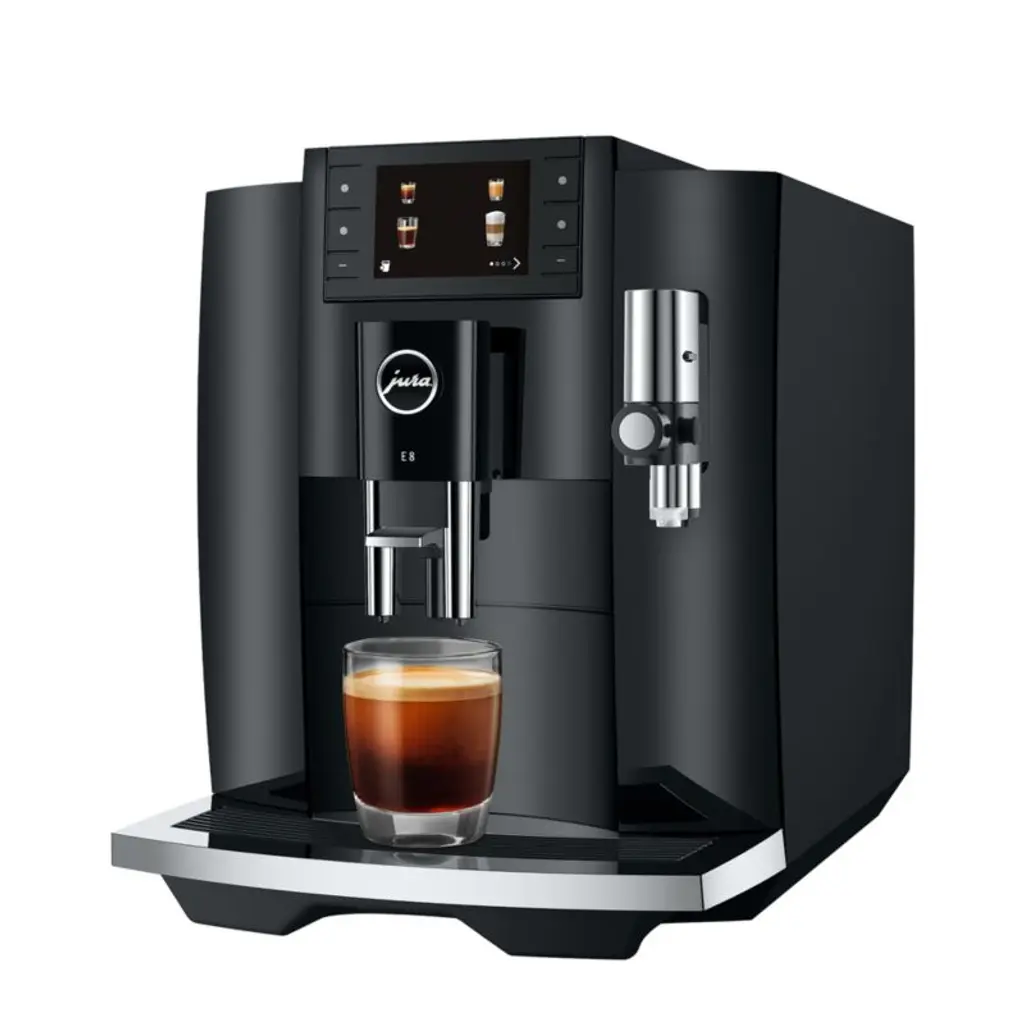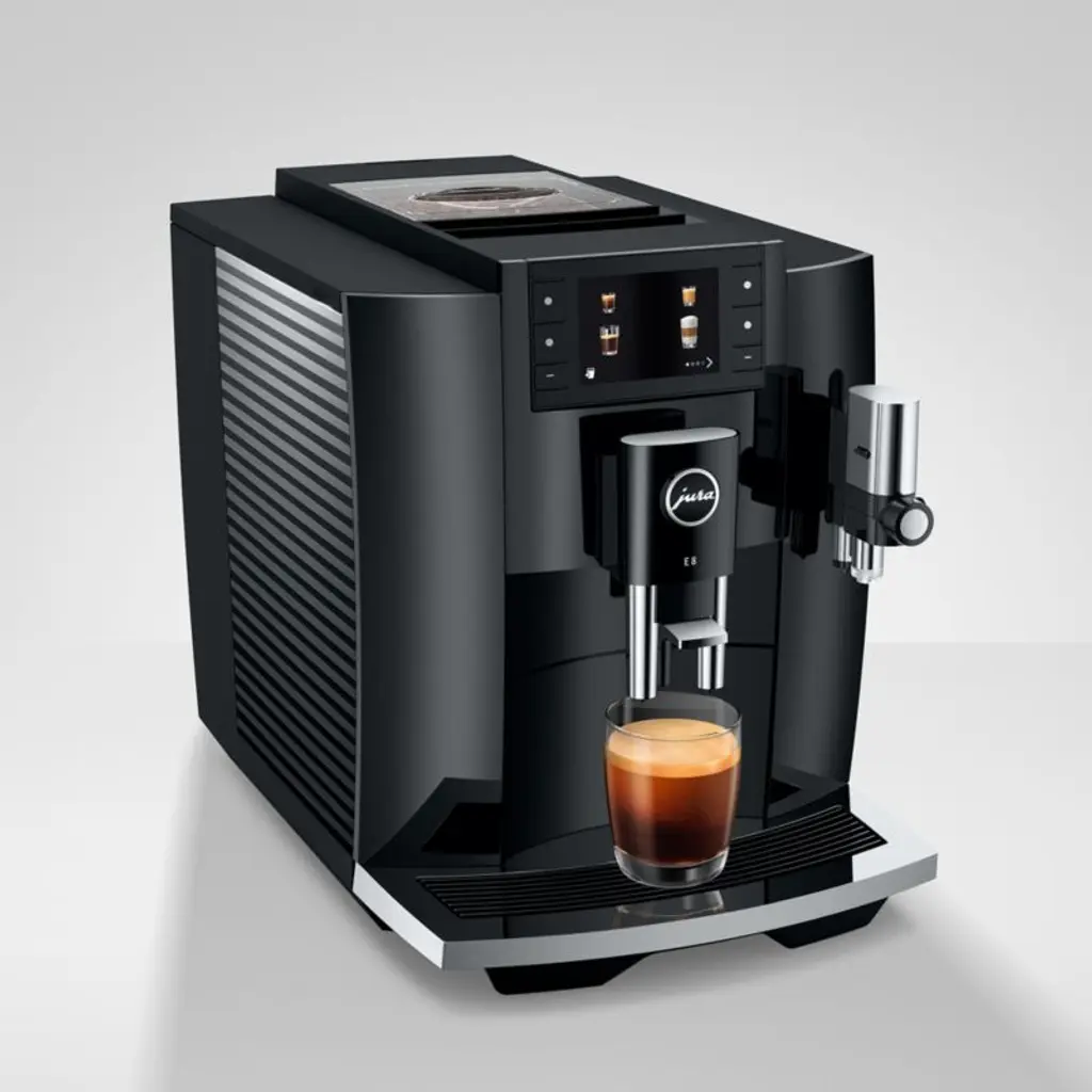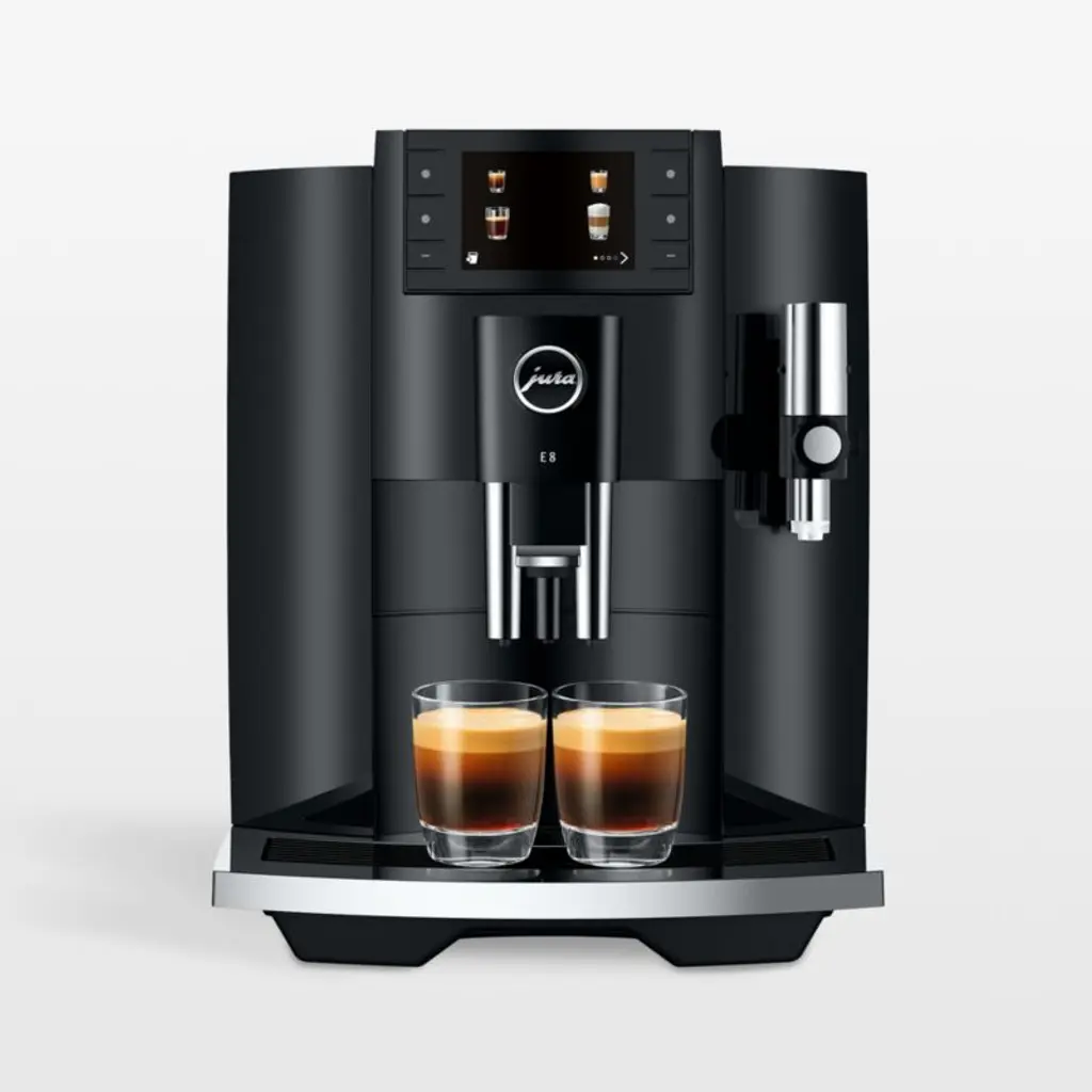 Now better than ever, the Jura E8 espresso machine is incredibly easy to use, combining state-of-the-art technology with a sleek modern design for delicious coffee. Prepare 17 coffee classics and specialty drinks at the push of a button for the same high quality you'd expect from a fine coffee bar. Thanks to the integrated coffee grinder, beans are always freshly ground, while an advanced brewing system ensures optimal extraction. It's simple to choose your favorite coffee drink with an enlarged and easy-to-use push-button display. To tailor Americanos to your liking there's a dedicated waterspout as part of the optimized fluid system. For those who like a more intense brew, the Extra Shot peps up cappuccinos or lattes. There's even one-touch cleaning of the milk system to keep your E8 primed and ready for your next coffee drink. Available in sleek black, this top-notch espresso machine delivers professional results for the home barista.Based in Switzerland, JURA has been creating inventive, high-end appliances since 1931 and has specialized in coffee and espresso machines since the 1980s.Need help choosing? View our JURA comparison chart.