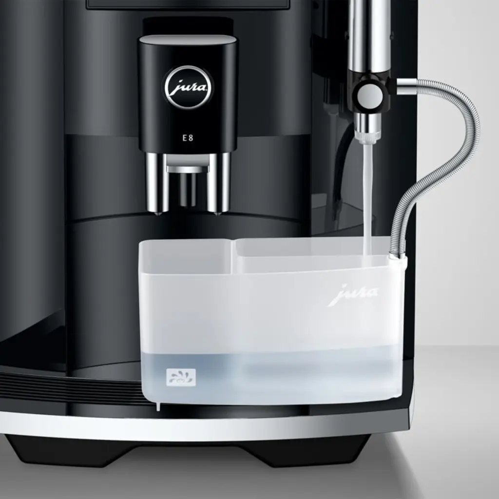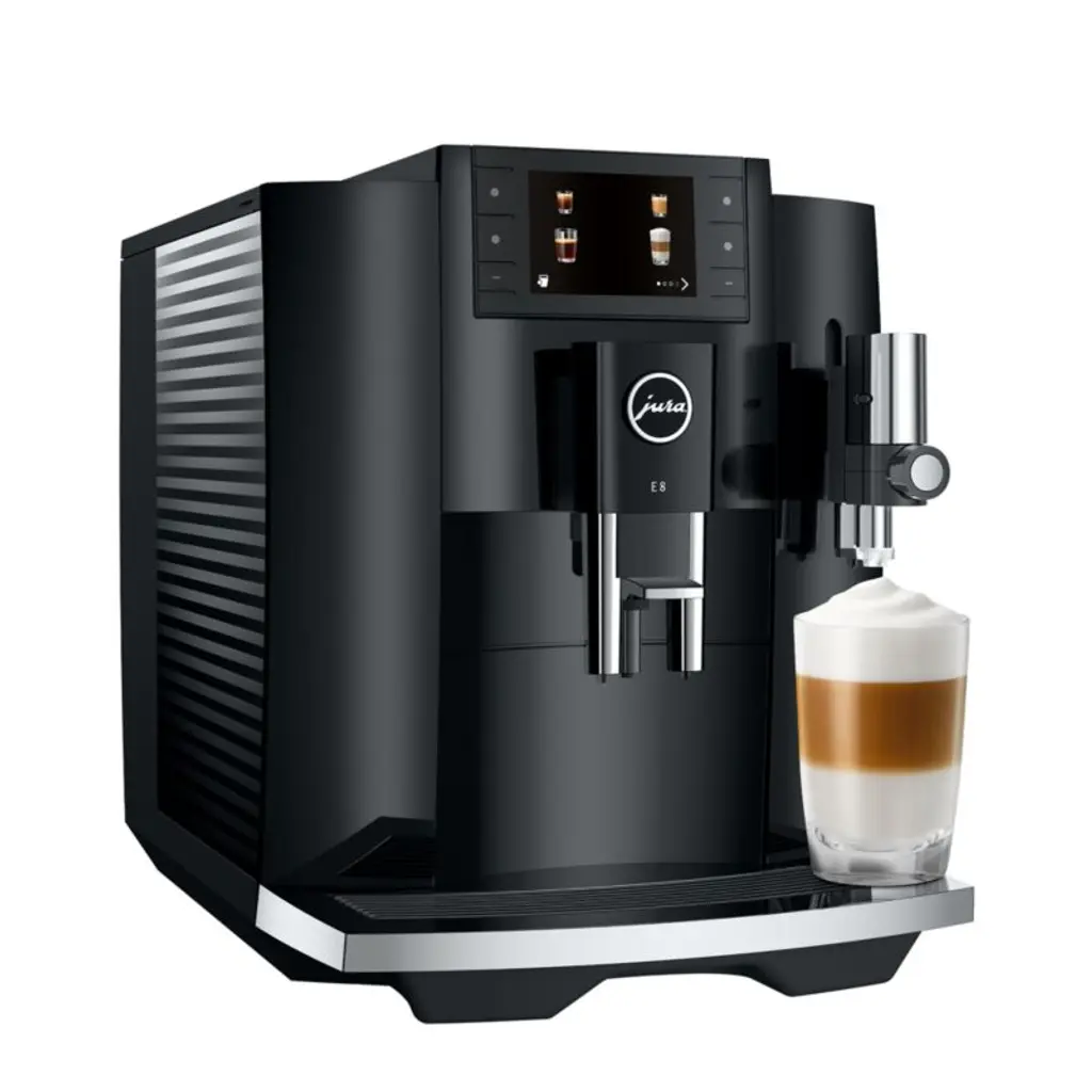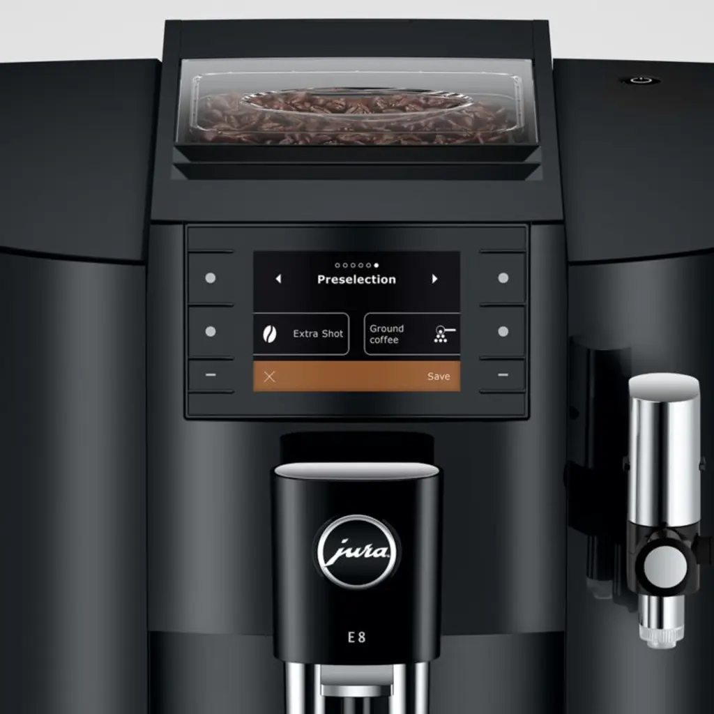 Now better than ever, the Jura E8 espresso machine is incredibly easy to use, combining state-of-the-art technology with a sleek modern design for delicious coffee. Prepare 17 coffee classics and specialty drinks at the push of a button for the same high quality you'd expect from a fine coffee bar. Thanks to the integrated coffee grinder, beans are always freshly ground, while an advanced brewing system ensures optimal extraction. It's simple to choose your favorite coffee drink with an enlarged and easy-to-use push-button display. To tailor Americanos to your liking there's a dedicated waterspout as part of the optimized fluid system. For those who like a more intense brew, the Extra Shot peps up cappuccinos or lattes. There's even one-touch cleaning of the milk system to keep your E8 primed and ready for your next coffee drink. Available in sleek black, this top-notch espresso machine delivers professional results for the home barista.Based in Switzerland, JURA has been creating inventive, high-end appliances since 1931 and has specialized in coffee and espresso machines since the 1980s.Need help choosing? View our JURA comparison chart.