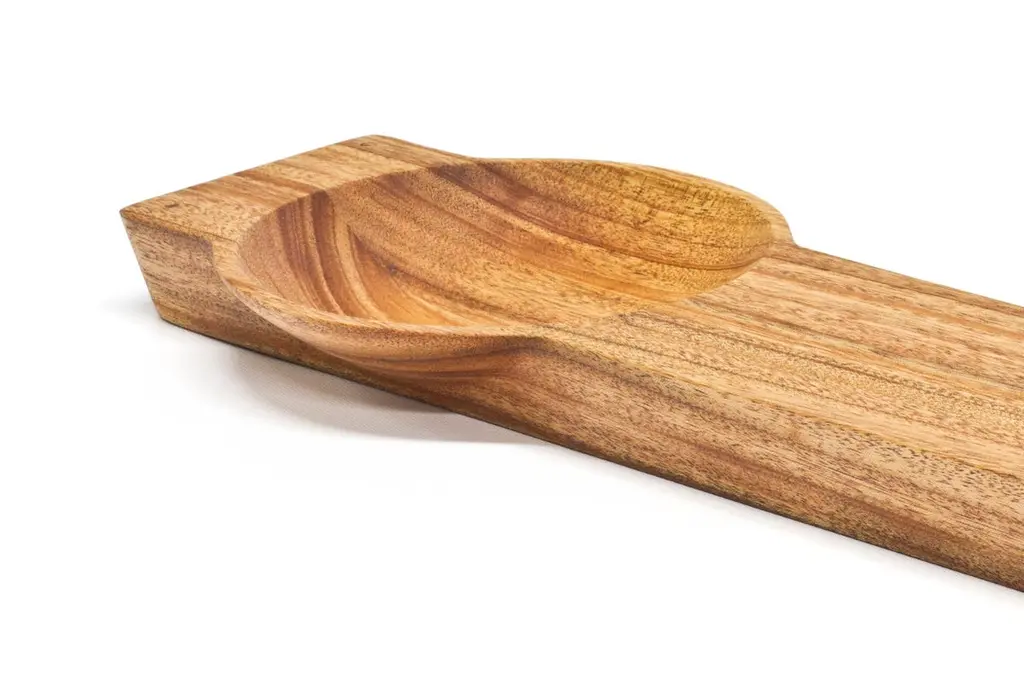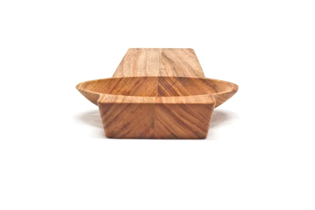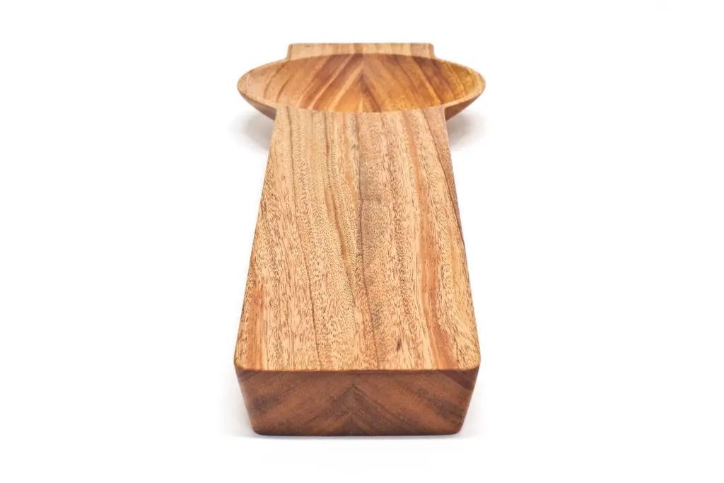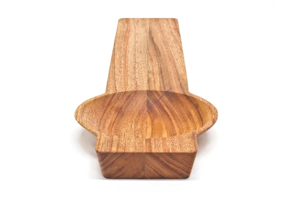 The Kafi 1 (Icelandic for submerged) hors d'oeuvre board has an elongated proportion that adds a dynamic appearance to any setting large or small. Recessed bowls provide a perfect showcase for olives, nuts, and fruits while the extended beveled plank is perfect for a variety of cheeses.About the designers: Tricia Wright and Martin Leugers are a San Francisco-based Industrial Design team who believe that building and making are integral to the design process. Their favourite projects transform a “problem” into an opportunity for invention, a way to create something unique, a chance to make life happier. Their goal is to design objects that do good in the world by focusing on products that directly improve people’s lives. Above all, as designers; they are practical, they make ideas a reality. Tricia and Martin have been recognized for their innovative designs, from high-tech to toys. They have been awarded multiple patents and numerous consumer and industry awards, including Toy of the Year.This Listing is for (One) Kafi 1 cheeseboard in mahogany. Due to the unique nature of wood, your piece may vary from the images shown.