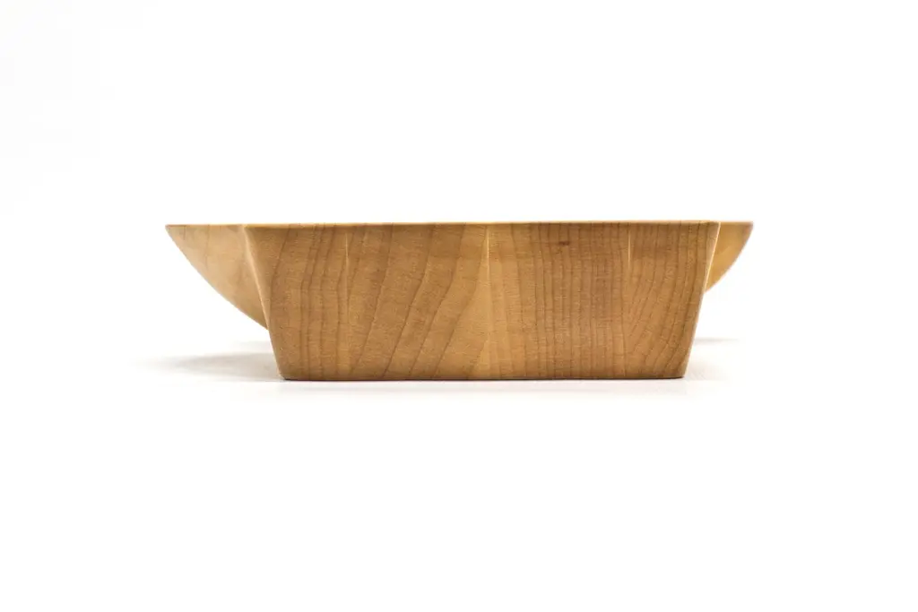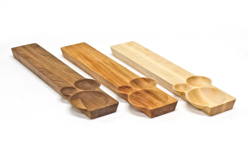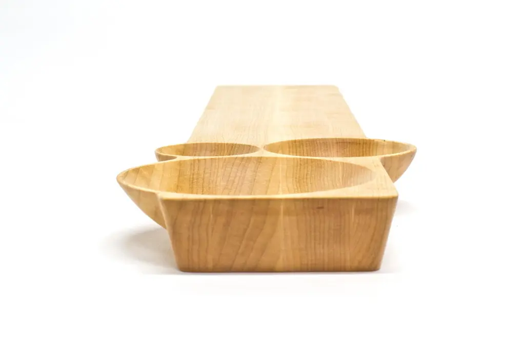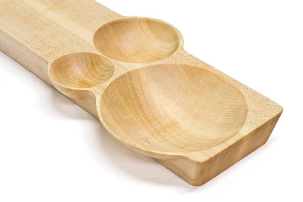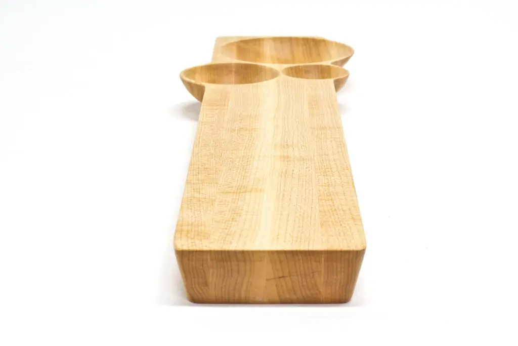 The Kafi 3 (Icelandic for submerged) hors d'oeuvre board has an elongated proportion that adds a dynamic appearance to any setting large or small. Recessed bowls provide a perfect showcase for olives, nuts, and fruits while the extended beveled plank is perfect for a variety of cheeses.About the designers: Tricia Wright and Martin Leugers are a San Francisco-based Industrial Design team who believe that building and making are integral to the design process. Their favorite projects transform a “problem” into an opportunity for invention, a way to create something unique, a chance to make life happier. Their goal is to produce objects that do good in the world by focusing on products that directly improves people’s lives. Above all, as designers; they are practical, they make ideas a reality. Tricia and Martin have been recognized for their innovative designs, from high-tech to toys. They have been awarded multiple patents and numerous consumer and industry awards, including Toy of the Year.This Listing is for (One) Kafi 3 cheeseboard in Maple. Due to the unique nature of wood, your piece may vary from the images shown.