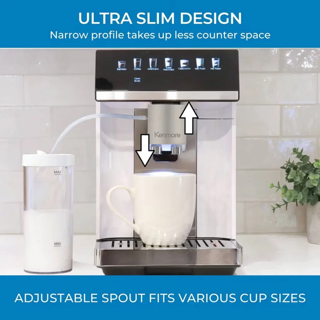 Kenmore's super-automatic coffee maker with dual-cream system puts a full cafe menu at your fingertips. The full color touchscreen display features 7 one-touch options including espresso, latte, and cappuccino, and lets you customize the strength and volume of any drink. Our Dual Cream System heats and froths dairy and non-dairy milk. With a built-in conical burr grinder and convenient self-cleaning functions, you can relax and let Kenmore be your barista.