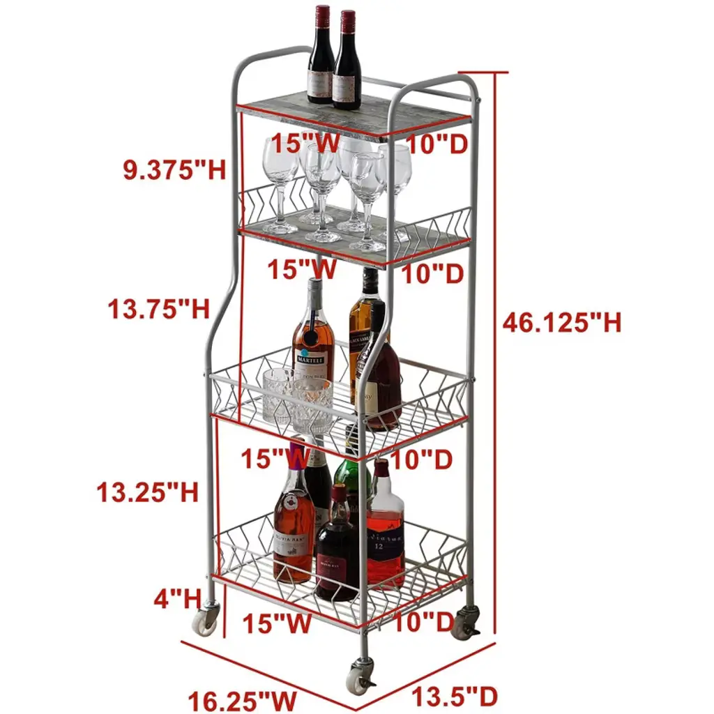 The Lexi Serving Cart (White) is a stylish and useful addition to your dining space. Crafted with a durable white metal tube frame, this cart features two wood upper shelves adorned with a sophisticated gray tile-style veneer. The lower shelves are constructed of durable metal wire, enclosed by an eye-catching decorative wire rim that adds a basket-like touch. The rolling casters on its legs, including two lockable ones, provide both mobility and stability to the piece. | Specifications | Frame Finish: White | Shelf Finish: Gray Tile | Frame Material: Metal Tube | Shelf Material: Wood with Veneer | Number of Shelves: 4 | Wheels: 2 Regular, 2 Locking | Assembly: Required | Dimensions | Overall Dimensions: 16"L x 14"W x 46"H | Shelves Size: 15"L x 10"W.