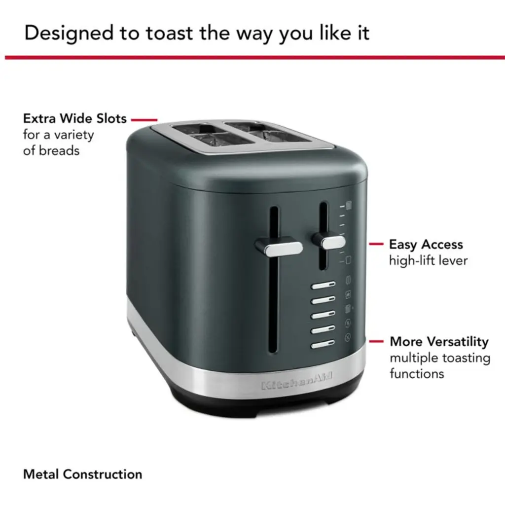 Finished in deep pine green, this toaster looks classic on your countertop. Two extra-wide slots easily accommodate thick slices of artisanal or homemade bread, and the shade control ensures anything you toast is finished to your liking. Use the Bagel function to toast the cut sides of English muffins and bagels (while gently warming the outsides) or the Little Longer function when something needs just a bit more browning.KitchenAid has been creating high-quality kitchenware for over a century.