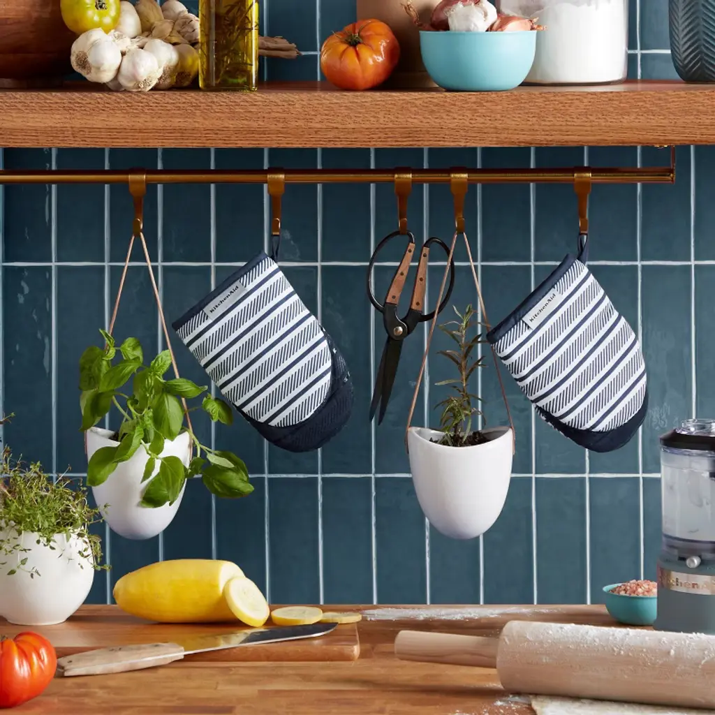 Safely handle your hot pots and pans with the KitchenAid Albany 2-Piece Mini Oven Mitt Set in Beet. Each mitt measures 5.5 inches wide by 8 inches long for easy on-and-off use while handling hot dishes. The durable, cotton fabric on the outside with polyester lining offers comfort and insulation. Clear, printed silicone on the mitts is heat resistant and ensures a more secure grip. A convenient hanging loop allows you to easily display or store these machine-washable mitts when not in use.