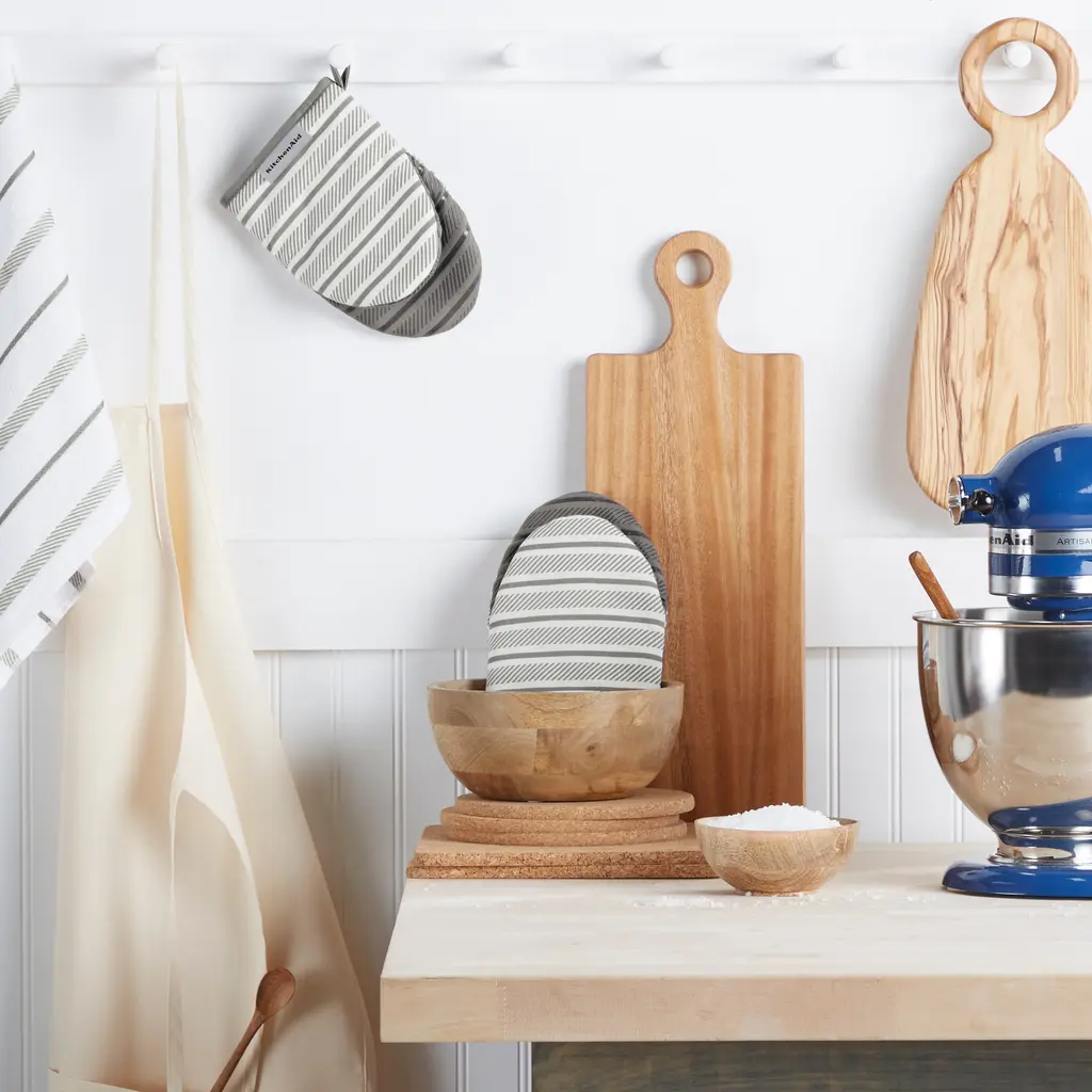 Safely handle your hot pots and pans with the Kitchen Aid Albany 2-Piece Mini Oven Mitt Set. These Kitchen Aid mini mitts each measure 5.5 inches wide by 8 inches long for easy on and off use while handling hot dishes. The durable, cotton fabric on the outside and polyester lining offers comfort and insulation. Clear printed silicone on the mitts are heat resistant and ensure a more firm and secure grip. Featuring a convenient hanging loop to easily display or store them when not in use. These mini mitts are machine washable for easy care.