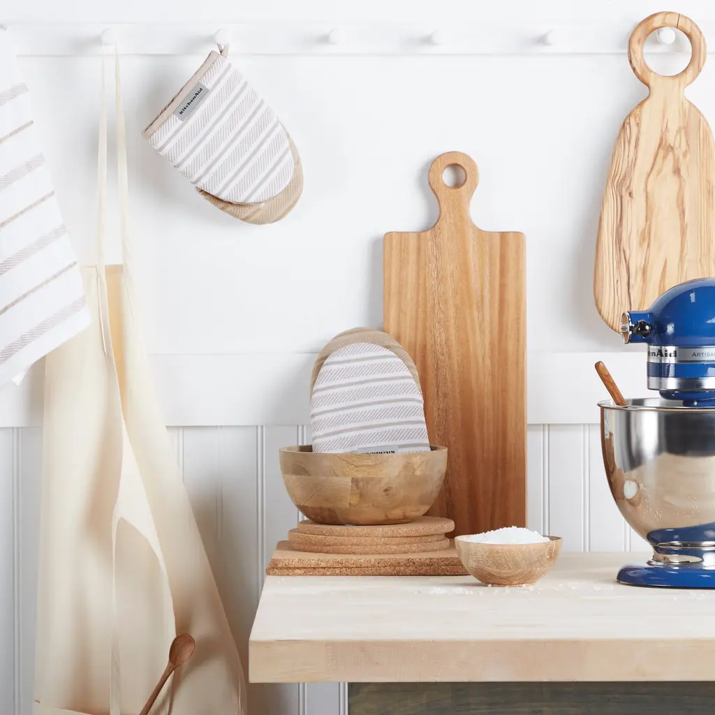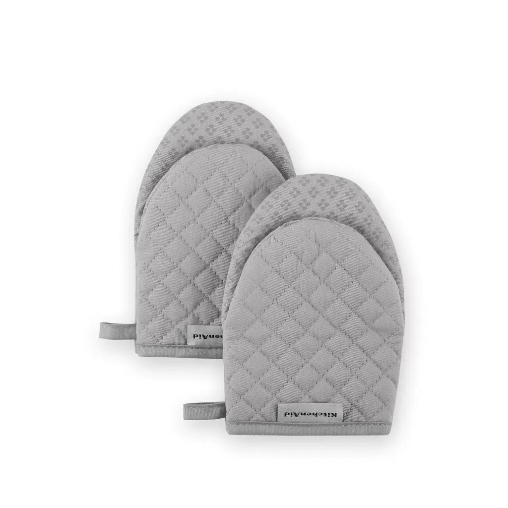 Safely handle your hot pots and pans with the Kitchen Aid Albany 2-Piece Mini Oven Mitt Set. These Kitchen Aid mini mitts each measure 5.5 inches wide by 8 inches long for easy on and off use while handling hot dishes. The durable, cotton fabric on the outside and polyester lining offers comfort and insulation. Clear printed silicone on the mitts are heat resistant and ensure a more firm and secure grip. Featuring a convenient hanging loop to easily display or store them when not in use. These mini mitts are machine washable for easy care.