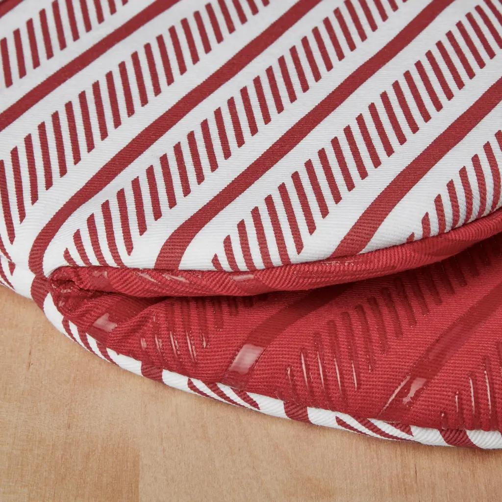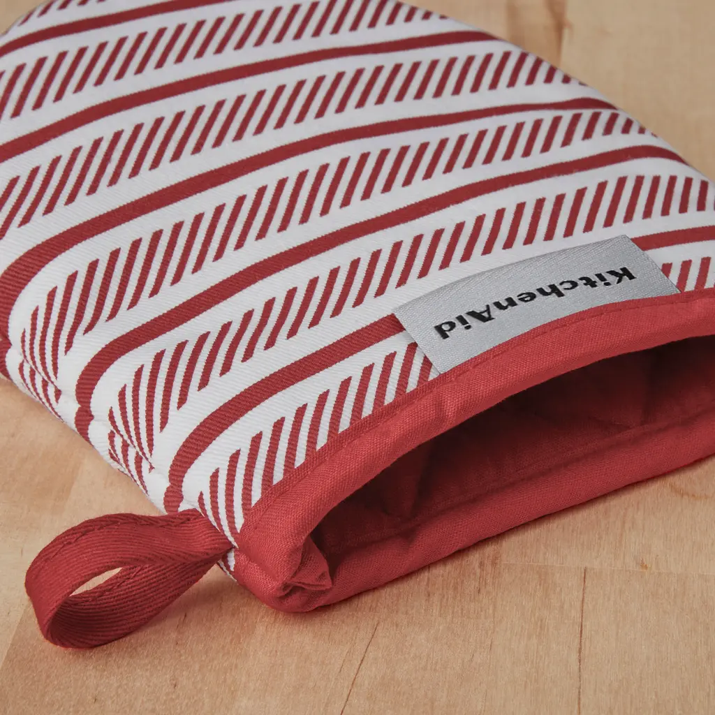 Safely handle your hot pots and pans with the Kitchen Aid Albany 2-Piece Mini Oven Mitt Set. These Kitchen Aid mini mitts each measure 5.5 inches wide by 8 inches long for easy on and off use while handling hot dishes. The durable, cotton fabric on the outside and polyester lining offers comfort and insulation. Clear printed silicone on the mitts are heat resistant and ensure a more firm and secure grip. Featuring a convenient hanging loop to easily display or store them when not in use. These mini mitts are machine washable for easy care.