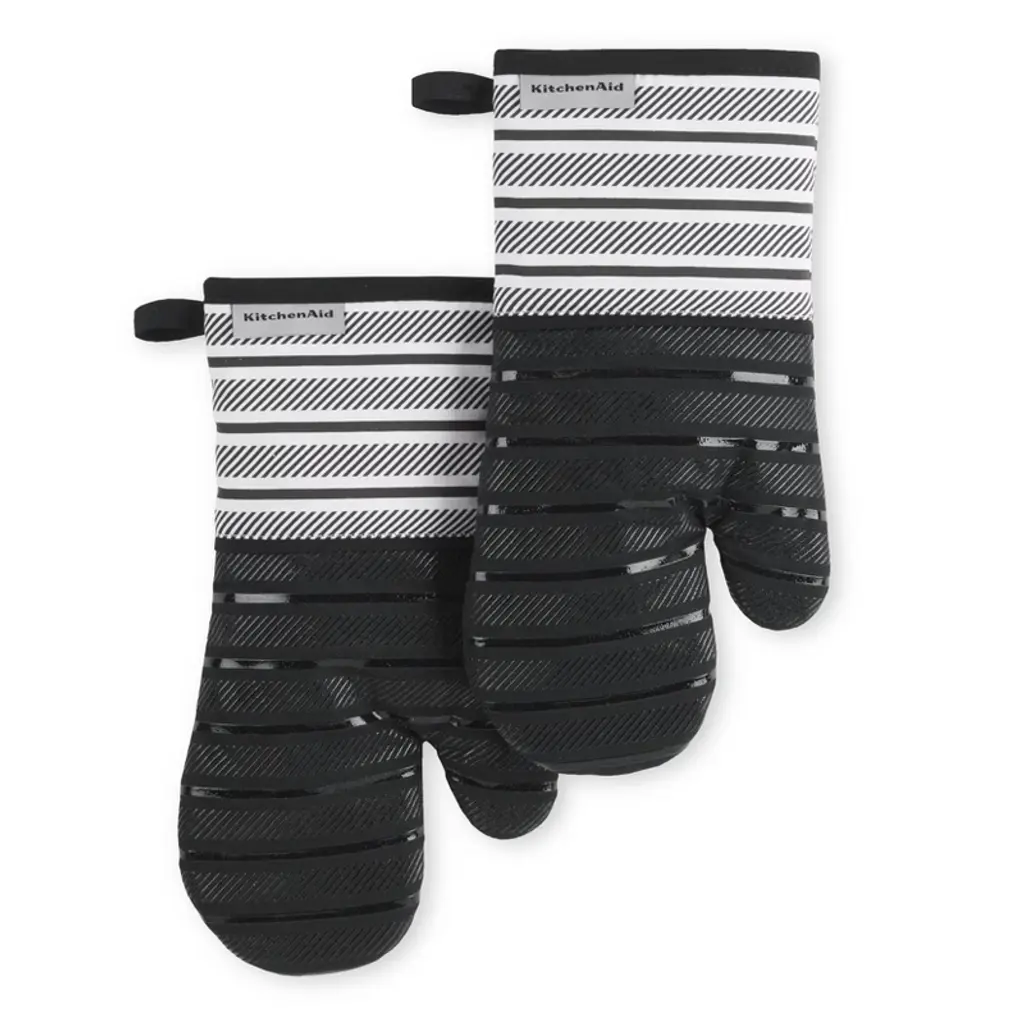 Safely handle your hot pots and pans with the KitchenAid Albany 2-Piece Oven Mitt Set in Aqua Sky. These generously sized mitts each measure 7 inches wide by 13 inches long for easy on-and-off use while handling hot dishes. The durable, cotton fabric on the outside and polyester lining offers comfort and insulation. Clear printed silicone on the mitts is heat resistant and ensures a more secure grip. This set is machine washable for easy care.