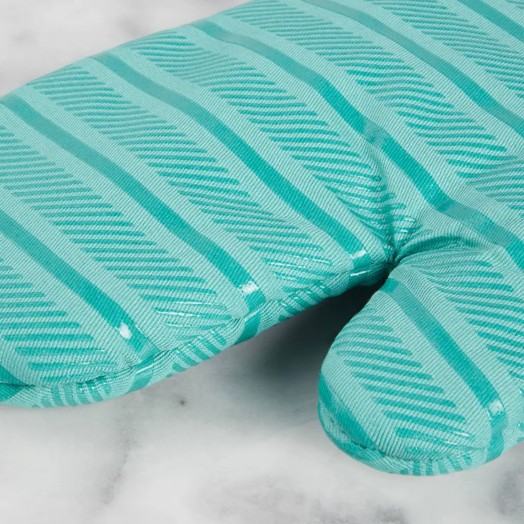 Safely handle your hot pots and pans with the KitchenAid Albany 2-Piece Oven Mitt Set in Aqua Sky. These generously sized mitts each measure 7 inches wide by 13 inches long for easy on-and-off use while handling hot dishes. The durable, cotton fabric on the outside and polyester lining offers comfort and insulation. Clear printed silicone on the mitts is heat resistant and ensures a more secure grip. This set is machine washable for easy care.