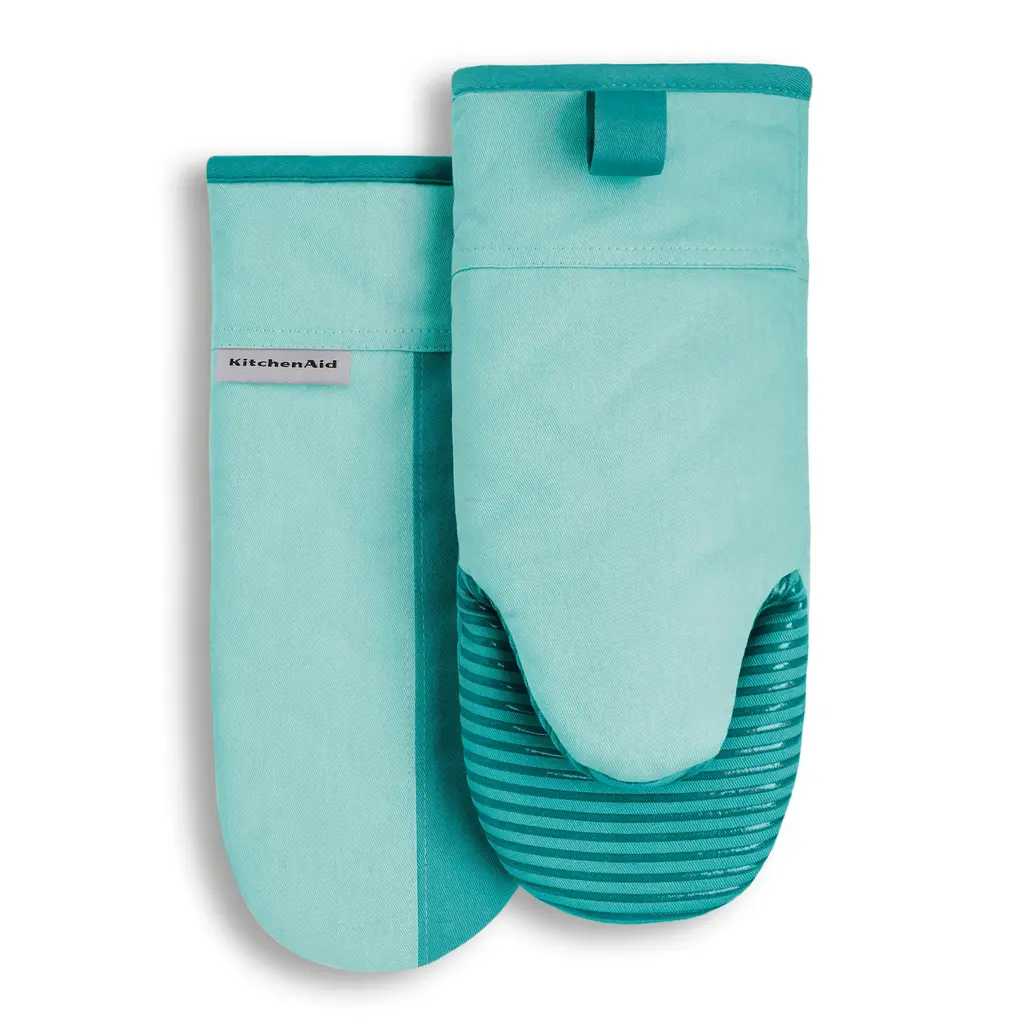 Safely handle your hot pots and pans with the KitchenAid Albany 2-Piece Oven Mitt Set in Aqua Sky. These generously sized mitts each measure 7 inches wide by 13 inches long for easy on-and-off use while handling hot dishes. The durable, cotton fabric on the outside and polyester lining offers comfort and insulation. Clear printed silicone on the mitts is heat resistant and ensures a more secure grip. This set is machine washable for easy care.