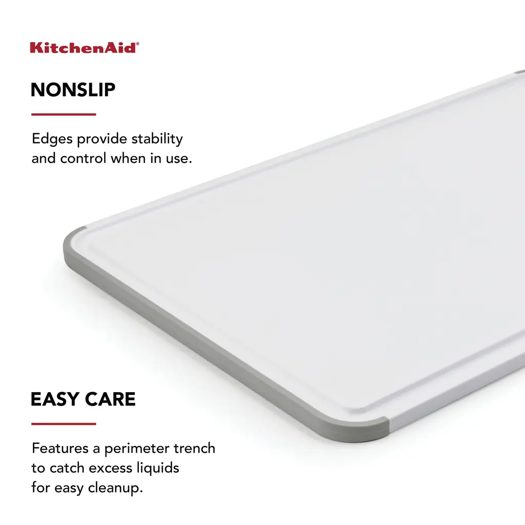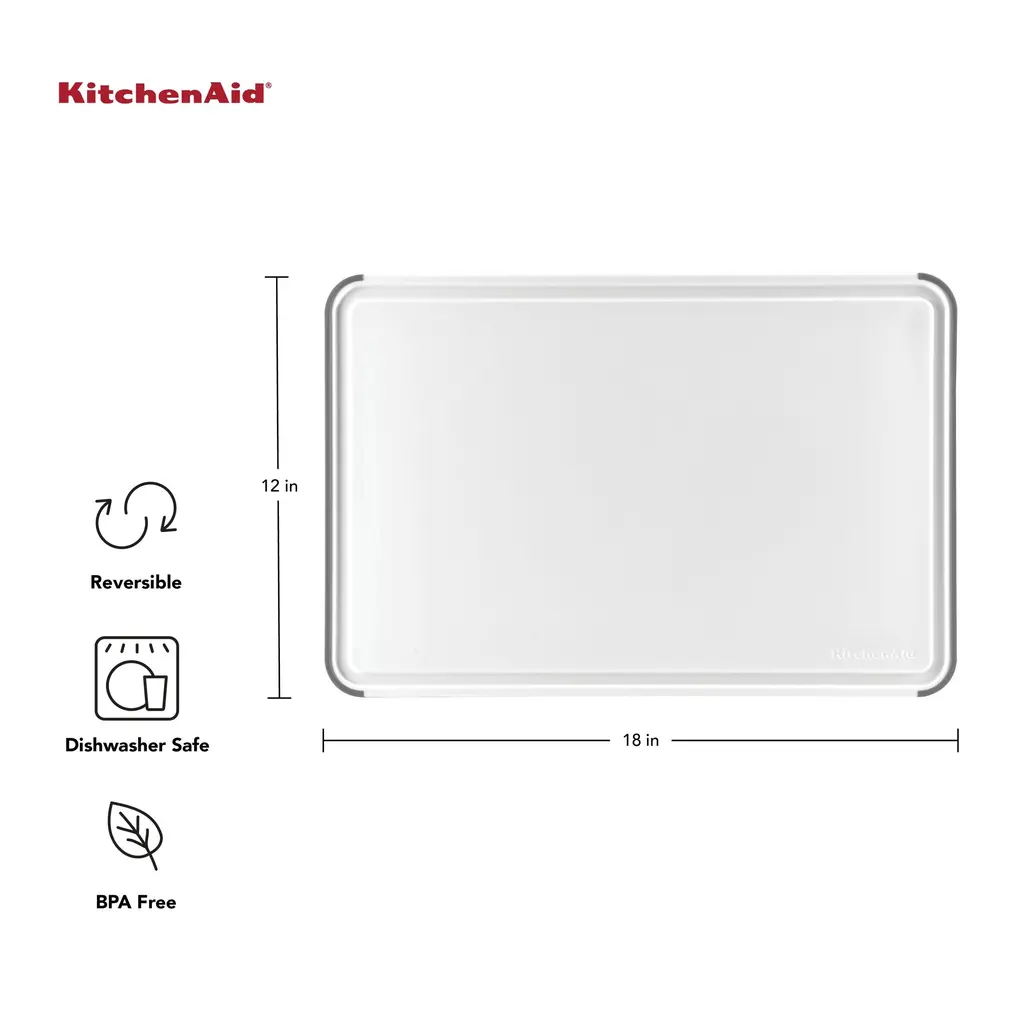 This KitchenAid Classic 12 x 18 White and Gray Cutting Board is the ideal size for slicing full-size roasts and poultry. Made of plastic, it is non-absorbent so it won't retain odors. It's gentle on blades so it won't dull knives, and reversible to double the cutting surface and help prevent cross-contamination. The nonslip, gray rubber edges provides stability on countertops, and a drainage groove frames the board to catch juices and cut down on messes. Measures 12 x 18 inches. Dishwasher safe.