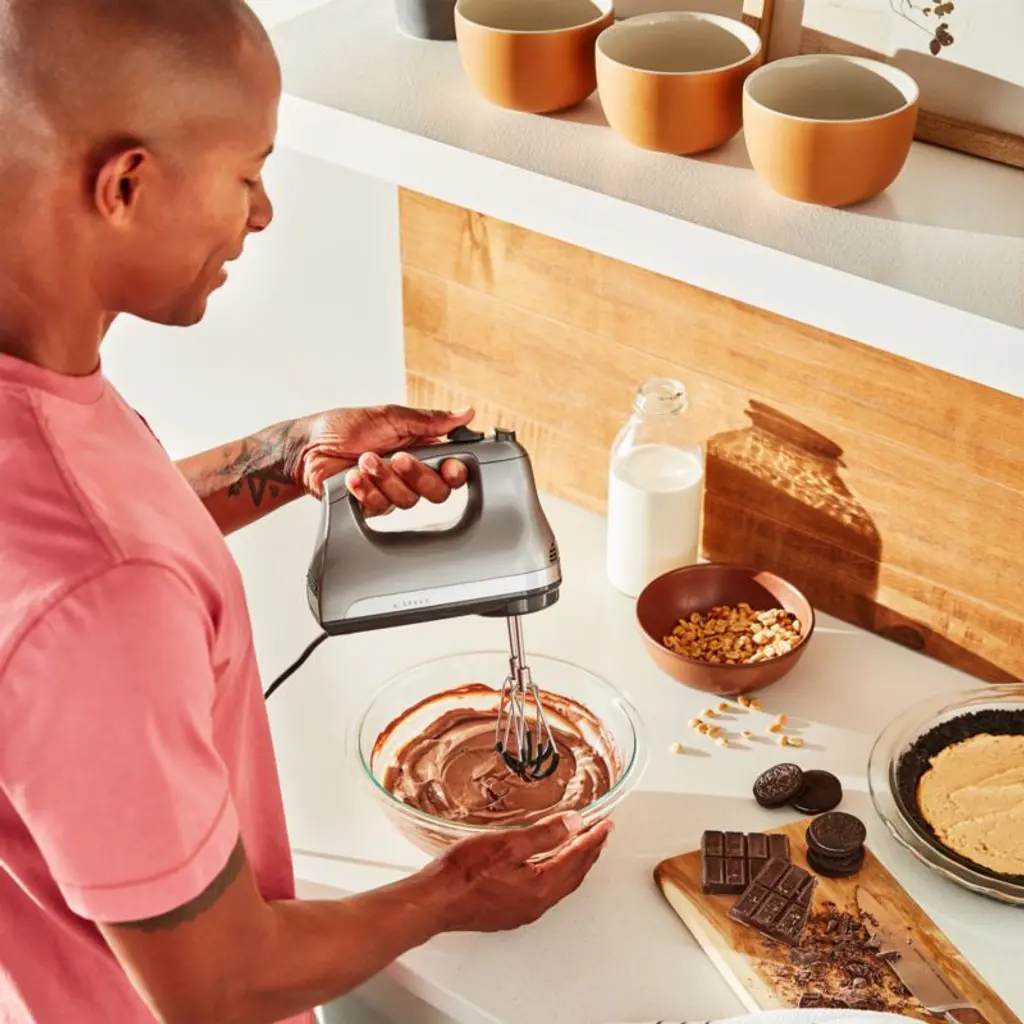 From the stand mixer mavens at KitchenAid, this hand mixer features a durable and quiet motor, a sleek silver finish and six speeds for versatility and control. The stainless steel flex-edge beaters coated in silicone reach a greater surface area for faster, more efficient mixing. The beaters and Pro Whiskideal for whipping egg whitesclean up easily in the dishwasher then attach to the mixer for compact storageKitchenAid has been creating high-quality kitchenware for over a centuryView all KitchenAid products