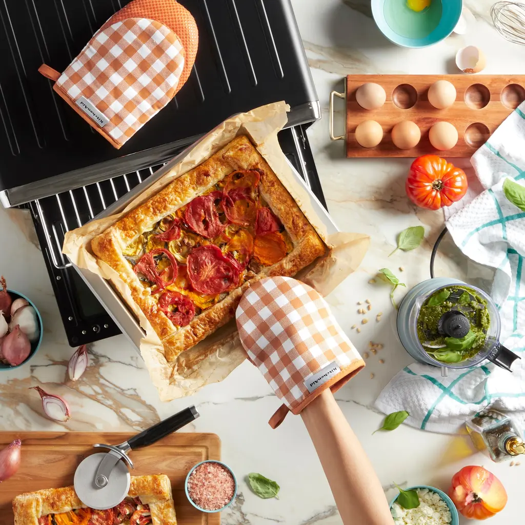 Protect your hands from hot pots and pans with the Kitchen Aid Gingham 2-Piece Mini Oven Mitt Set. This set includes 2 mini oven mitts that each measure 5.5 inches wide by 8 inches long for easy on and off use with a classic checkered print pattern. Made of cotton fabric with polyester lining that offers comfort and insulation. These mitts are heat resistant with clear printed silicone to ensure a more firm and secure grip. Featuring a convenient hanging loop for display or easy storage.