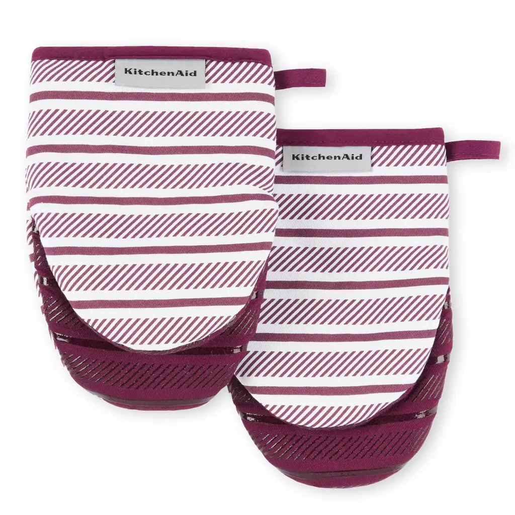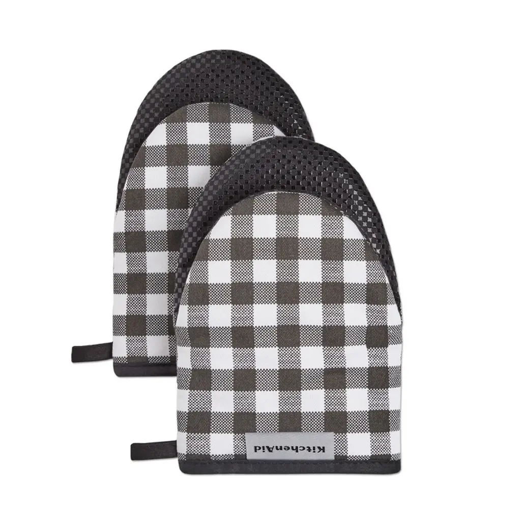Protect your hands from hot pots and pans with the Kitchen Aid Gingham 2-Piece Mini Oven Mitt Set. This set includes 2 mini oven mitts that each measure 5.5 inches wide by 8 inches long for easy on and off use with a classic checkered print pattern. Made of cotton fabric with polyester lining that offers comfort and insulation. These mitts are heat resistant with clear printed silicone to ensure a more firm and secure grip. Featuring a convenient hanging loop for display or easy storage.