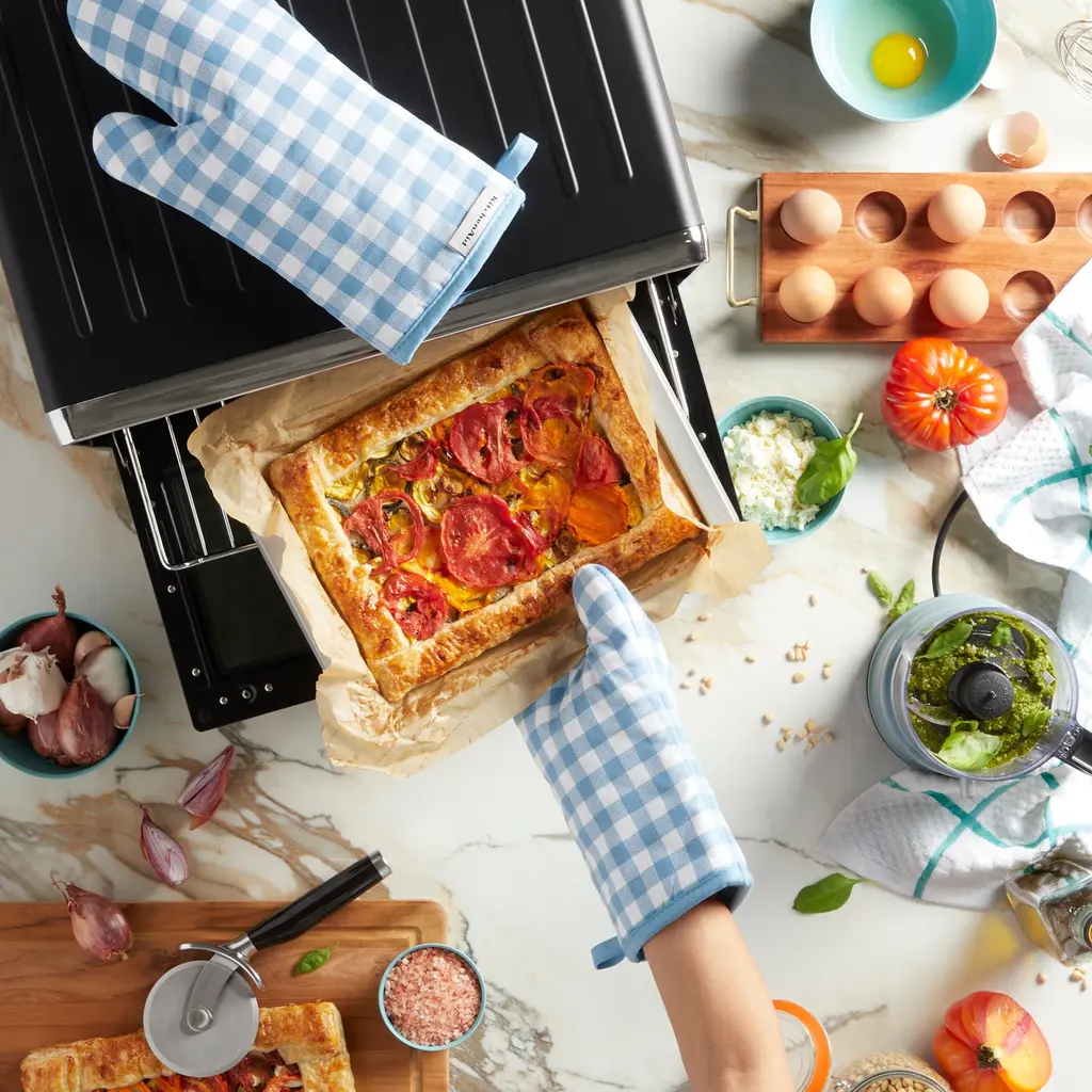 Protect your hands from hot pots and pans with the KitchenAid Gingham 2-Piece Oven Mitt Set in Aqua Sky. Each generously sized oven mitt measures 7 inches wide by 13 inches long for easy on-and-off use and features a classic checkered print pattern. Made of 100% cotton that offers comfort and insulation, these mitts are heat resistant and machine washable for easy care.