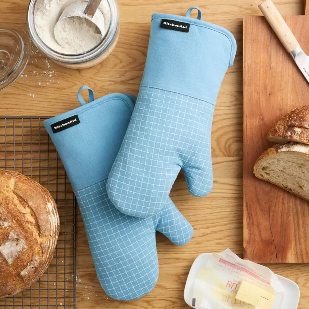 Protect your hands with the KitchenAid Gourmet Series Gridlines Oven Mitt 2-Pack Set. Heat resistant up to 600°F, these oven mitts feature slip-resistant silicone grips with a windowpane grid design, extra-thick padding for added protection, and a 100% cotton exterior with polyester lining. Designed for convenience, they include magnetic cuffs and hanging loops for easy storage and are machine washable for hassle-free cleaning. Stylish and functional, they’re perfect for any kitchen task. Coordinate with KitchenAid kitchen linens and tools for a cohesive look.