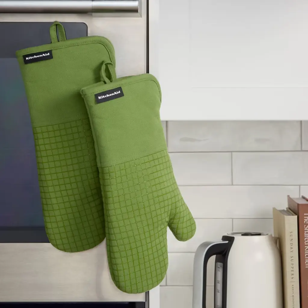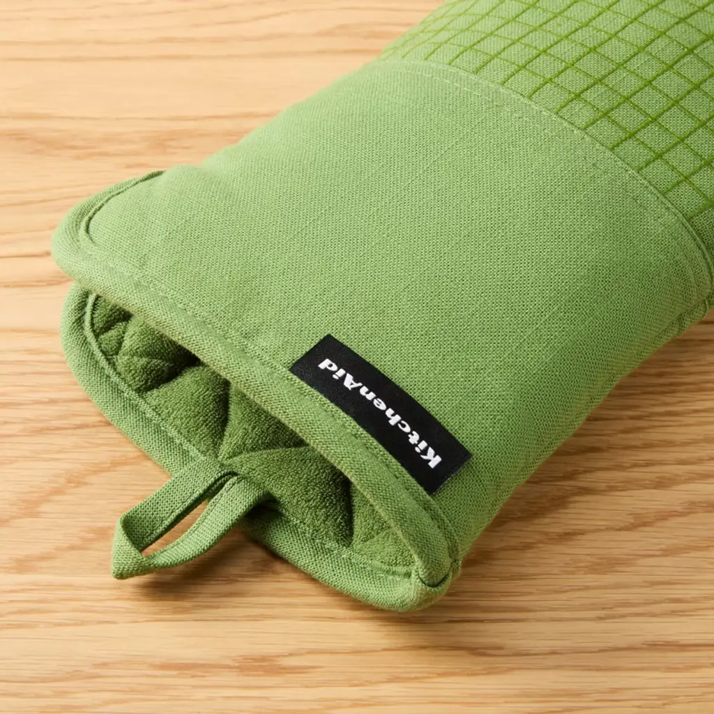 Kitchenaid Gourmet Series Gridlines Oven Mitts 2-pack Set, Heat Resistant Up To 600°f, Soft Silicone Grip, Magnetic Cuff, Matcha Green, 7"x14"