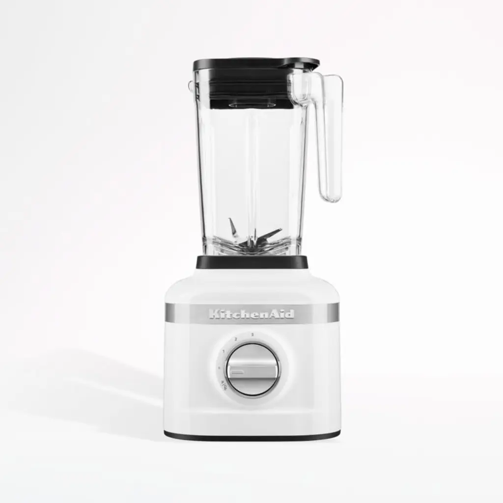 Equipped with a uniquely asymmetrical stainless steel blade and powerful motor, this glossy white blender crushes ice in less than 10 seconds and gets impeccably smooth results out of even the toughest ingredients. The ingenious Soft Start feature prevents splatters by starting the motor gently, pulling ingredients into the blade and gradually increasing speed to the desired setting. Intelligent motor control senses the pitcher's contents, maintaining the ideal speed to power through them effectively. Two lidded personal blender jars take smoothies on the go and store sauces in the refrigerator.View all KitchenAid productsNeed help choosing? View our KitchenAid Blender comparison chart.