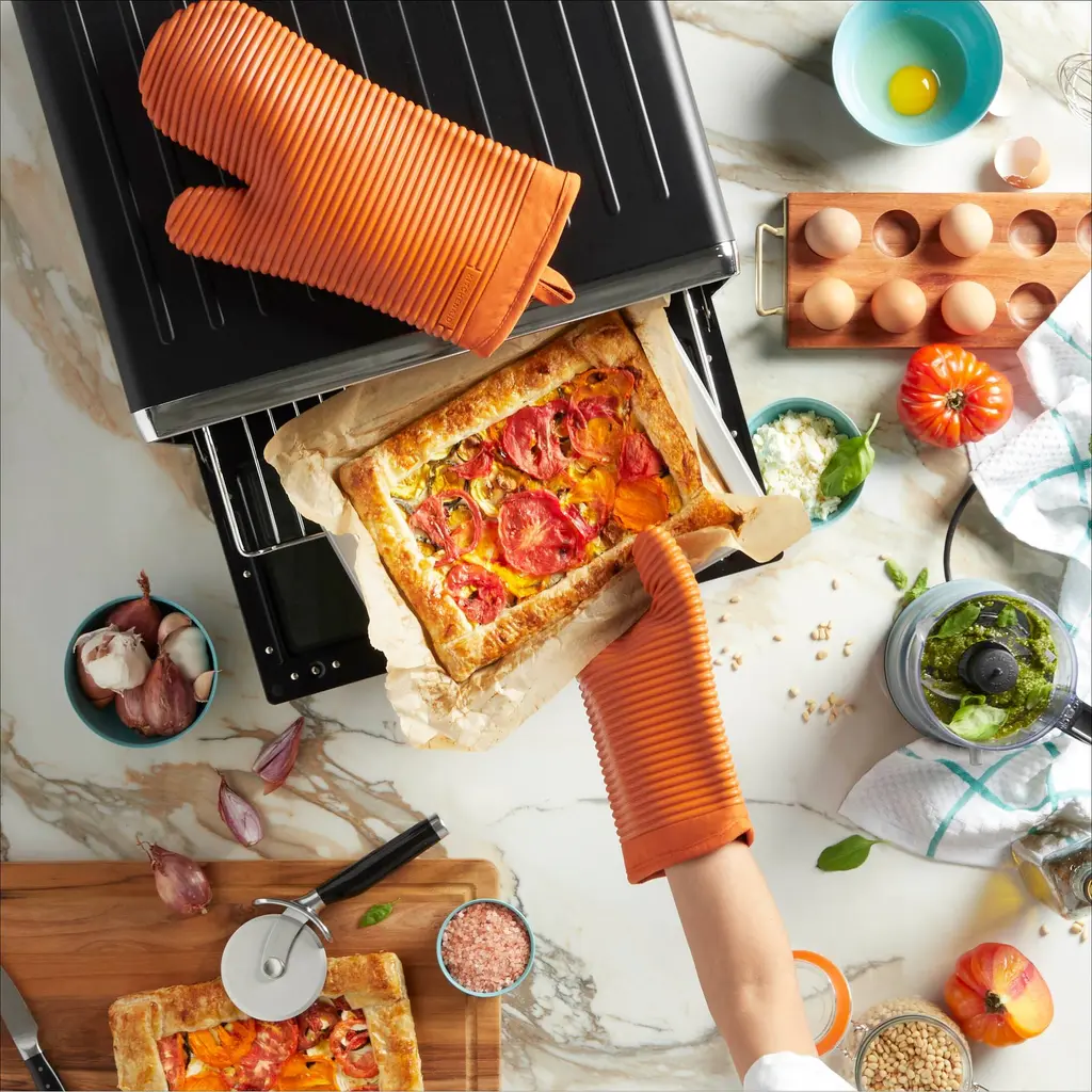 Perform your kitchen tasks safely with the KitchenAid Ribbed Soft Silicone 2-Piece Oven Mitt Set. The textured, ribbed stripe design offers a secure grip while handling hot objects. Made of durable and waterproof silicone with a cotton cuff that provides additional shield from the heat and polyester lining that offers comfort and insulation. Each oven mitt measures 7.5 inches by 13 inches for a generous fit. They are heat resistant up to 500 degrees Fahrenheit. Coordinate these oven mitts with coordinating KitchenAid Ribbed Soft Silicone Pot Holders for a complete set. Features: 2025 COLOR OF THE YEAR: coordinates with KitchenAid 2025 Color of the Year Butter Yellow appliances, textiles, and kitchen tools for a stylish look