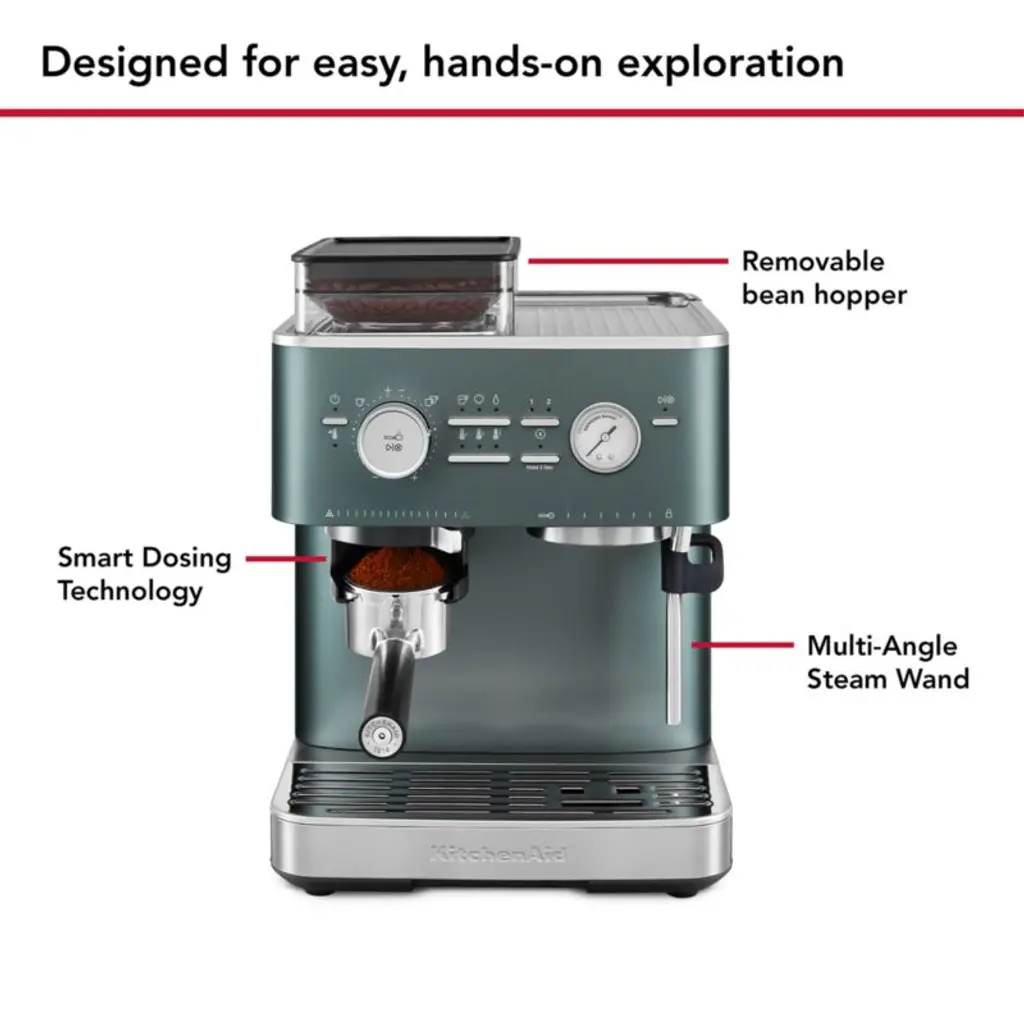Craft cafe-worthy macchiatos, lattes and more made just to your liking with this semi-automatic espresso machine. Offering 15 grinding levels to suit your beans and drink choice, the machine provides smart and manual dosing options plus a stable flat-bottom portafilter for even tamping. The multi-angle steam wand easily froths silky foam for luxe cappuccinos and cafe au laits. Finished in deep green enamel enhanced with a touch of blue and the crisp sparkle of metallic flake, this machine brings a fresh juniper-inspired hue to your countertop or coffee station.KitchenAid has been creating high-quality kitchenware for over a century.