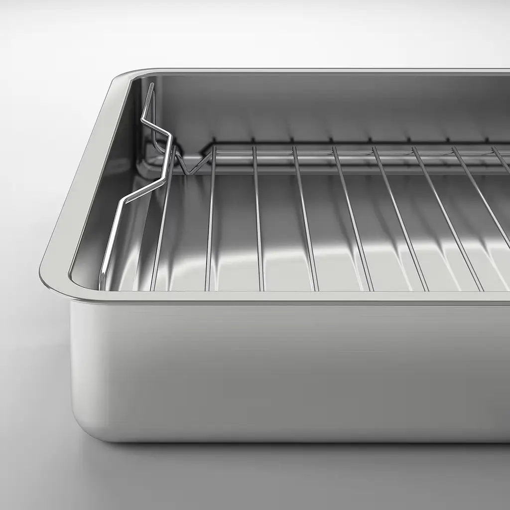 KONCIS Roasting pan with grill rack - stainless steel 16x13 ". A perfect all-in-one roasting tin for the oven or barbeque. At the bottom there is room for potatoes and vegetables and on the grill rack you can put chicken or steak. Made of stainless steel that is dishwasher safe.