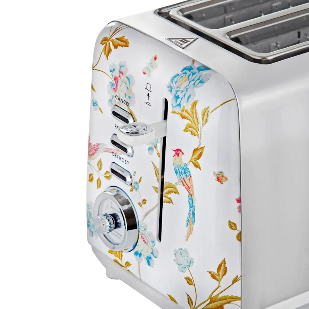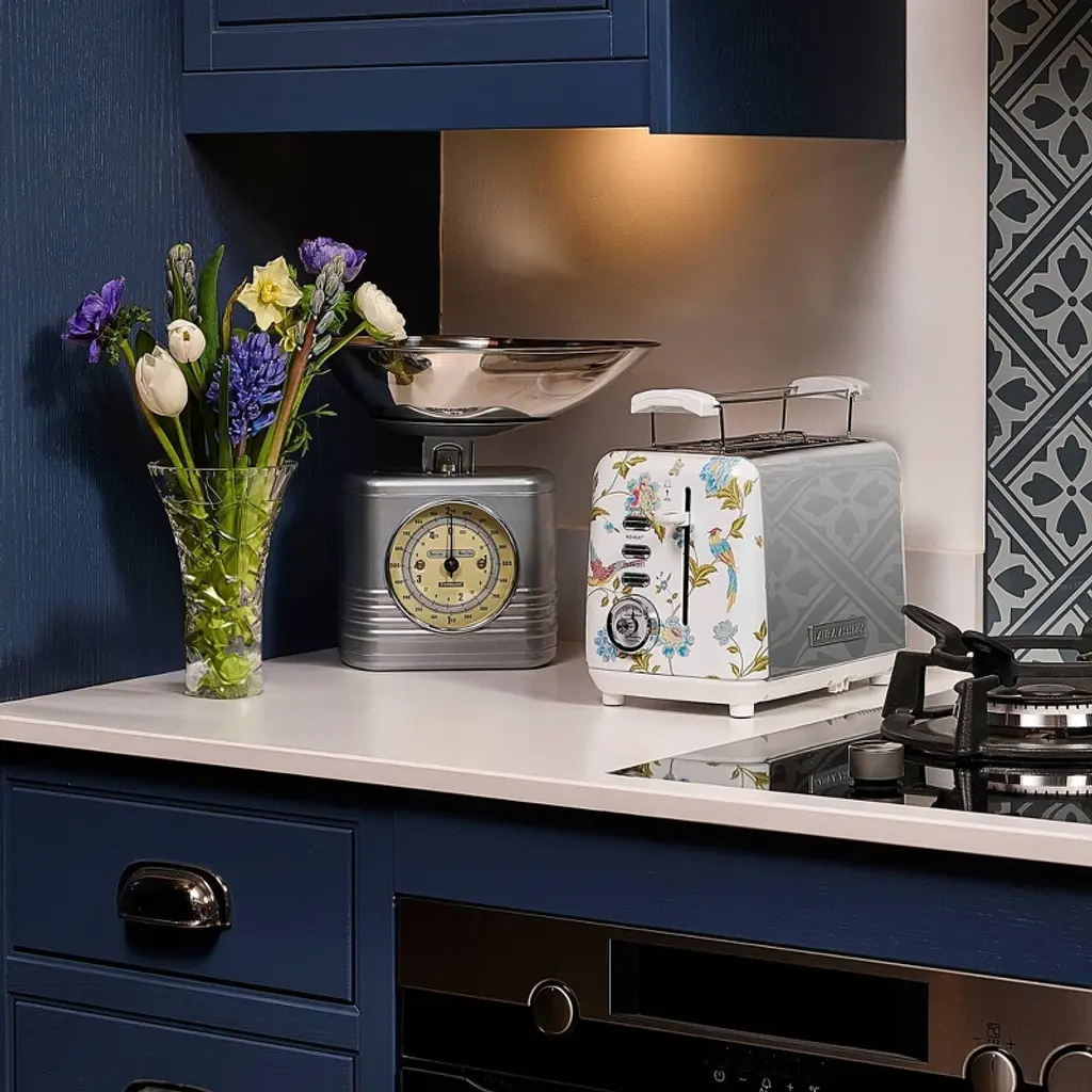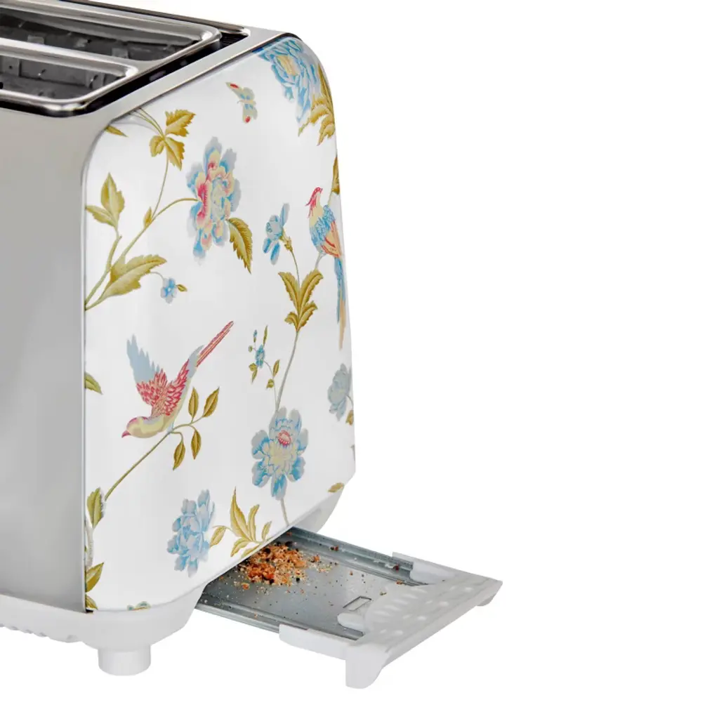 If you're looking for a multi-functional toaster that not only makes the perfect toast but can cook tasty bagels, luscious crumpets, and wholesome thick-sliced bread then look no further! The VQ Laura Ashley 2-Slice Toaster is the perfect match to make your breakfast and style your kitchen at the same time.Your VQ Laura Ashley Toaster features the stunning hand-applied Elveden print. Each toaster is hand decorated and finished with a high-grade gloss UV coating to ensure it looks pristine day in day out. The Elveden print itself took inspiration from the Summer Palace design, launching in the 1980s and remains popular to this very day.This 2-Slice toaster has all the features needed to create the perfect breakfast for your friends and family. The seven-setting variable heat control gives you precise toasting. A high-lift lever making it safe and easy to remove your warm toasties without burning your fingers. Made with high-grade durable stainless-steel, it is built to last and easy to keep clean in the kitchen. An auto-centring feature to evenly toast on all sides, no matter how thick or thin. You can even warm up croissants on the warming rack included for that delicious continental style breakfast.