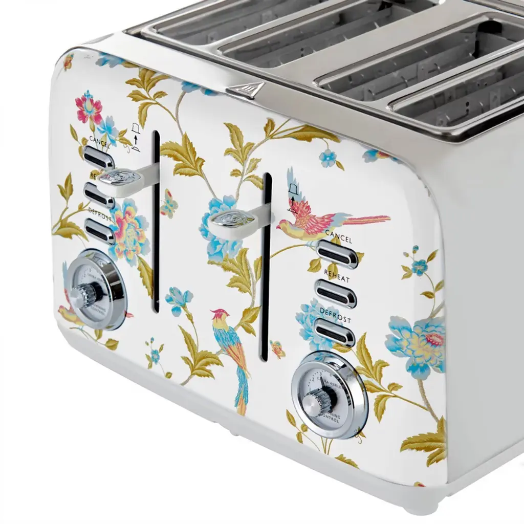 If you're looking for a multi-functional toaster that not only makes the perfect toast but can cook tasty bagels, luscious crumpets, and wholesome thick-sliced bread then look no further! The VQ Laura Ashley 4-Slice Toaster is the perfect match to make your breakfast and style your kitchen at the same time.Your VQ Laura Ashley Toaster features the stunning hand-applied Elveden print. Each toaster is hand decorated and finished with a high-grade gloss UV coating to ensure it looks pristine day in day out. The Elveden print itself took inspiration from the Summer Palace design, launching in the 1980s and remains popular to this very day.This 4-Slice toaster has all the features needed to create the perfect breakfast for your friends and family. The seven-setting variable heat control gives you precise toasting. A high-lift lever making it safe and easy to remove your warm toasties without burning your fingers. Made with high-grade durable stainless-steel, it is built to last and easy to keep clean in the kitchen. An auto-centring feature to evenly toast on all sides, no matter how thick or thin. You can even warm up croissants on the warming rack included for that delicious continental style breakfast.