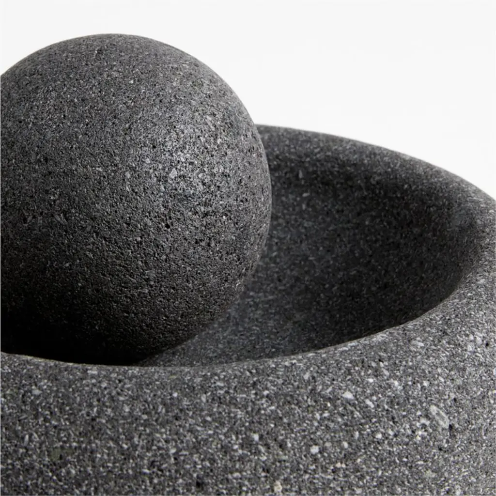 This sculptural mortar and pestle crafted of lava stone elevates a handy kitchen tool into a display-worthy statement piece. The dark grey set reinterprets the pestle as a large sphereits weight helpful for crushing seeds, spices, nuts and herbsnestled in a low, rounded mortar. We love the modern design language the exaggerated curves bring to the kitchen.