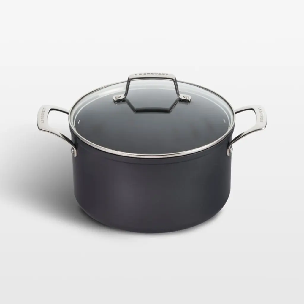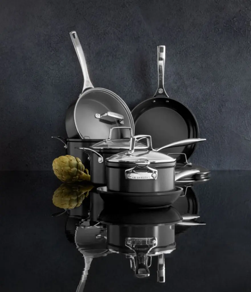 Cookware legend Le Creuset introduces essential aluminum cookware that delivers superior non-stick performance. Constructed with stainless steel bases and reinforced rims to prevent warping, this heavy-gauge cookware set distributes and retains heat evenly. The advanced ceramic non-stick coating browns without oil or butter, releases food easily, resists scratching, cleans up quickly and is safe for use with metal utensils. This 10-piece set is fitted with ergonomic stainless steel handles that stay cool for comfortable cooking.