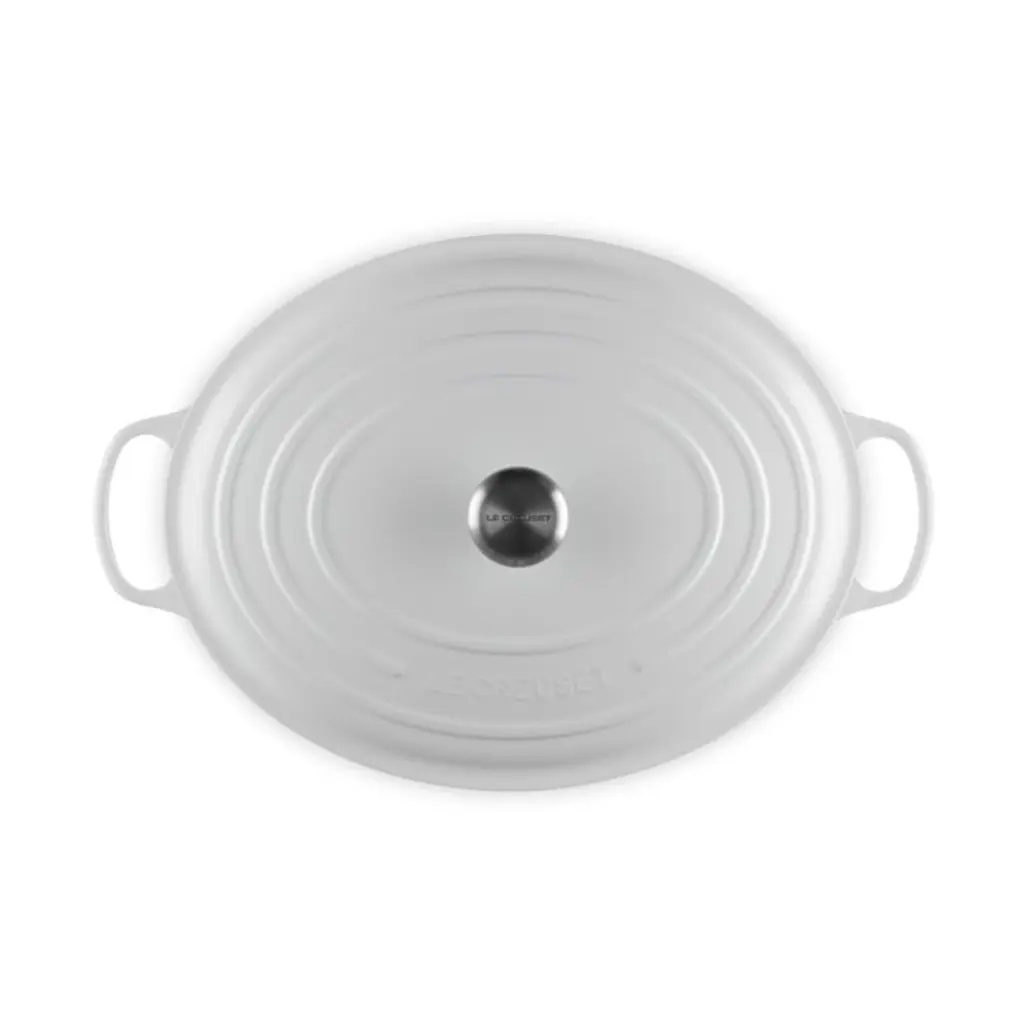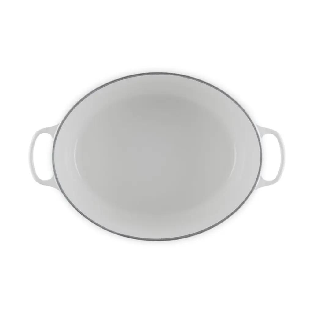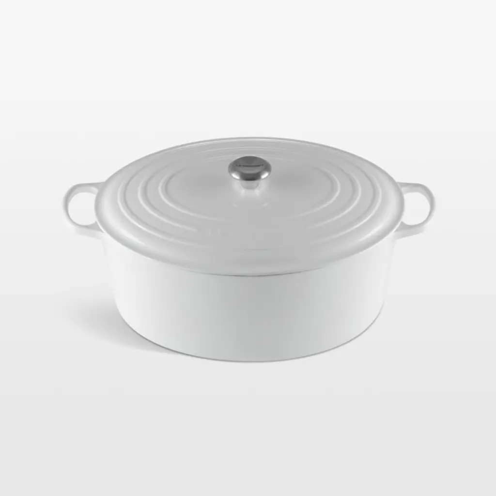 Inspired by oversized cast iron ovens dating back centuries, this goose pot accommodates whole chickens, large roasts, generous loaves of bread or enough chili for a crowd. Deep walls and a secure lid make this pot indispensable for slow-cooking, braising, searing, roasting and baking. The oval oven maintains even and consistent heat and has a smooth interior that promotes caramelization, resists stains and prevents sticking for easy cleanup. Glazed bright white and topped with a gleaming stainless steel knob, the display-worthy goose pot makes a stately centerpiece for family gatherings and holiday feasts.Revered by both professional chefs and home cooks since its 1925 debut, Le Creuset's classic French cookware is prized for its utilitarian beauty and unsurpassed heat retention.