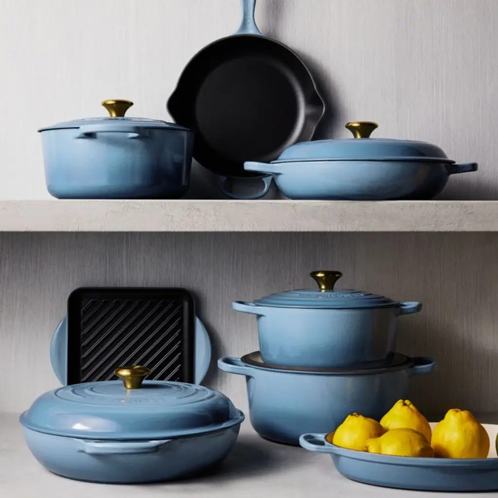Curated for us exclusively, this gorgeous shade of blue is as casual and chic as your favorite pair of jeans. The creamy blue enamel coating is not only beautiful, it also ensures that the cast iron Dutch oven is impervious to acid, alkali, odors and stains. Indispensable for slow-cooking, braising, searing, roasting or baking, the lidded pot delivers even and consistent heat. The smooth interior promotes caramelization, resists stains and prevents sticking for easy cleanup. Compatible with all types of cooktops from gas to induction, the Dutch oven boasts easy-to-grip handles that make it easy to move from stovetop to oven to table.Revered by both professional chefs and home cooks since its 1925 debut, Le Creuset's classic French cookware is prized for its utilitarian beauty and unsurpassed heat retention.