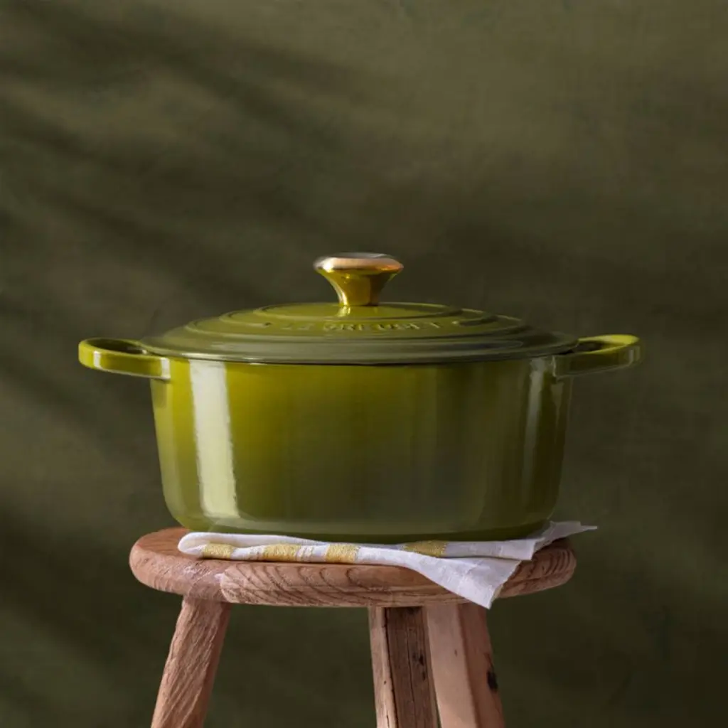 Inspired by California's olive groves, the sunbathed green enamel that coats this Dutch oven glows with a hint of invigorating yellow. The warmly hued cast iron oven is indispensable for slow-cooking, braising, searing, roasting or baking. The round pot maintains even and consistent heat and has a smooth interior that promotes caramelization, resists stains and prevents sticking for easy cleanup. Sized to cook five to six servings, the display-worthy Dutch oven is ideal for casual weeknight meals and elegant dinners. Use the lidded pot topped with a gold-finished knob for a sprightly spring presentation of whatever's on the menu, including leek stew, olive bread or rhubarb cobbler.Revered by both professional chefs and home cooks since its 1925 debut, Le Creuset's classic French cookware is prized for its utilitarian beauty and unsurpassed heat retention.