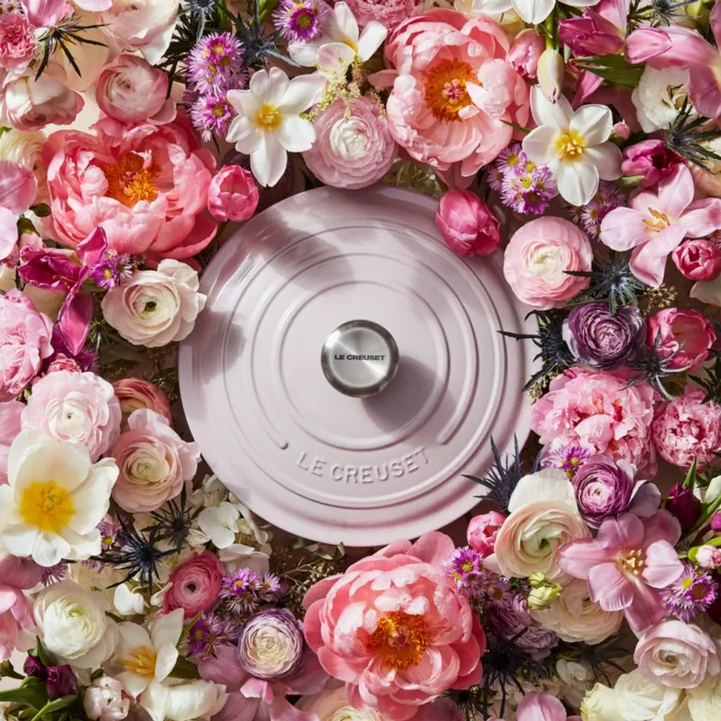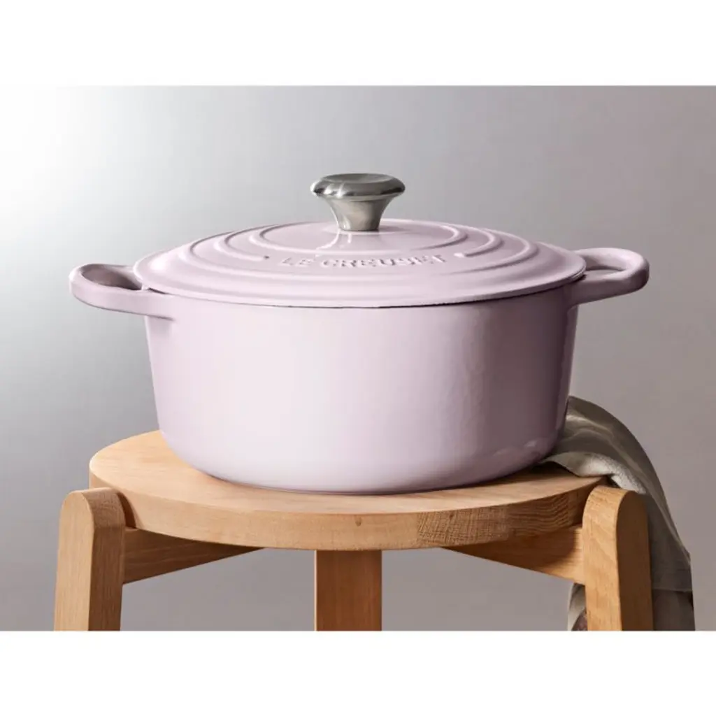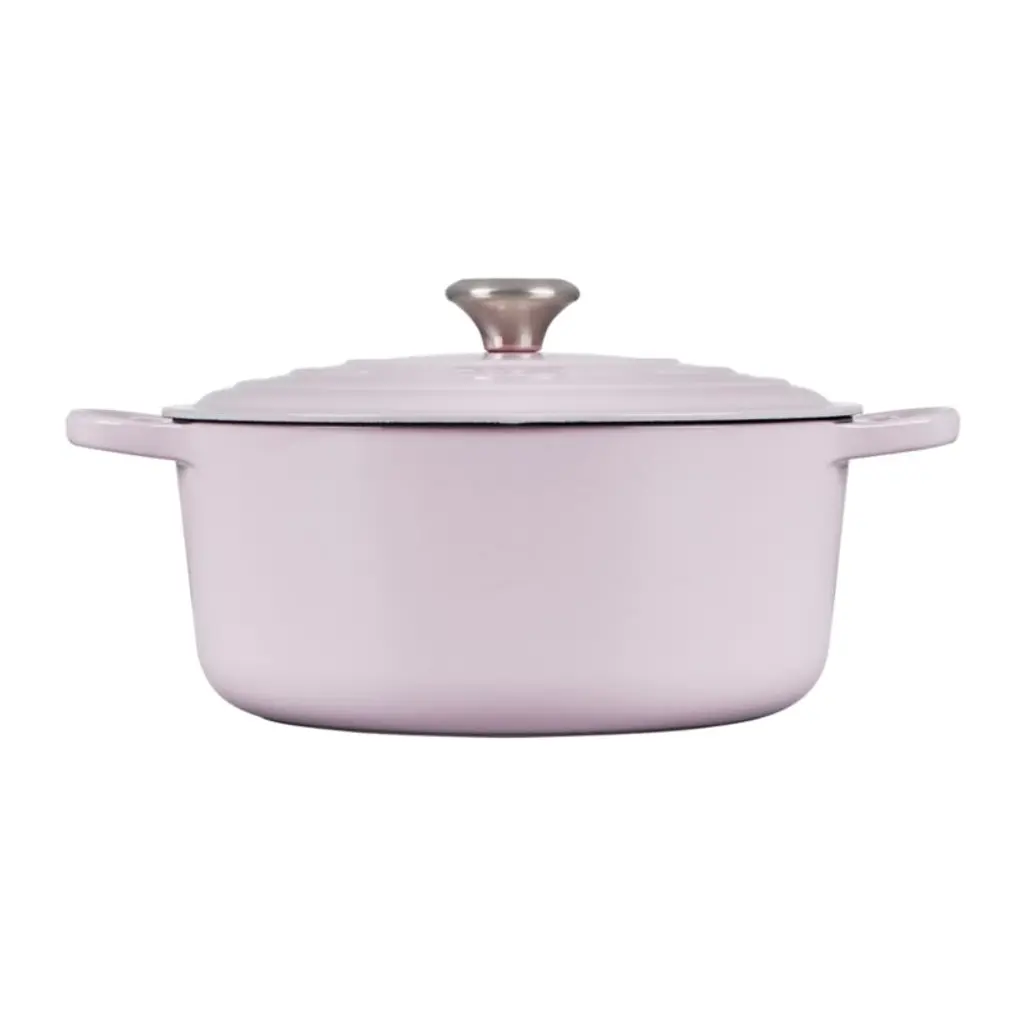 Enameled in creamy blush-purple inspired by shallots, this gorgeous cast iron oven is indispensable for slow-cooking, braising, searing, roasting or baking. The round pot maintains even and consistent heat and has a smooth interior that promotes caramelization, resists stains and prevents sticking for easy cleanup. Sized to cook seven to eight servings, the display-worthy Dutch oven is ideal for casual weeknight meals and elegant dinners. Use the lidded pan for whatever's on the menu, including posole, sourdough bread or a roast chicken.Revered by both professional chefs and home cooks since its 1925 debut, Le Creuset's classic French cookware is prized for its utilitarian beauty and unsurpassed heat retention.