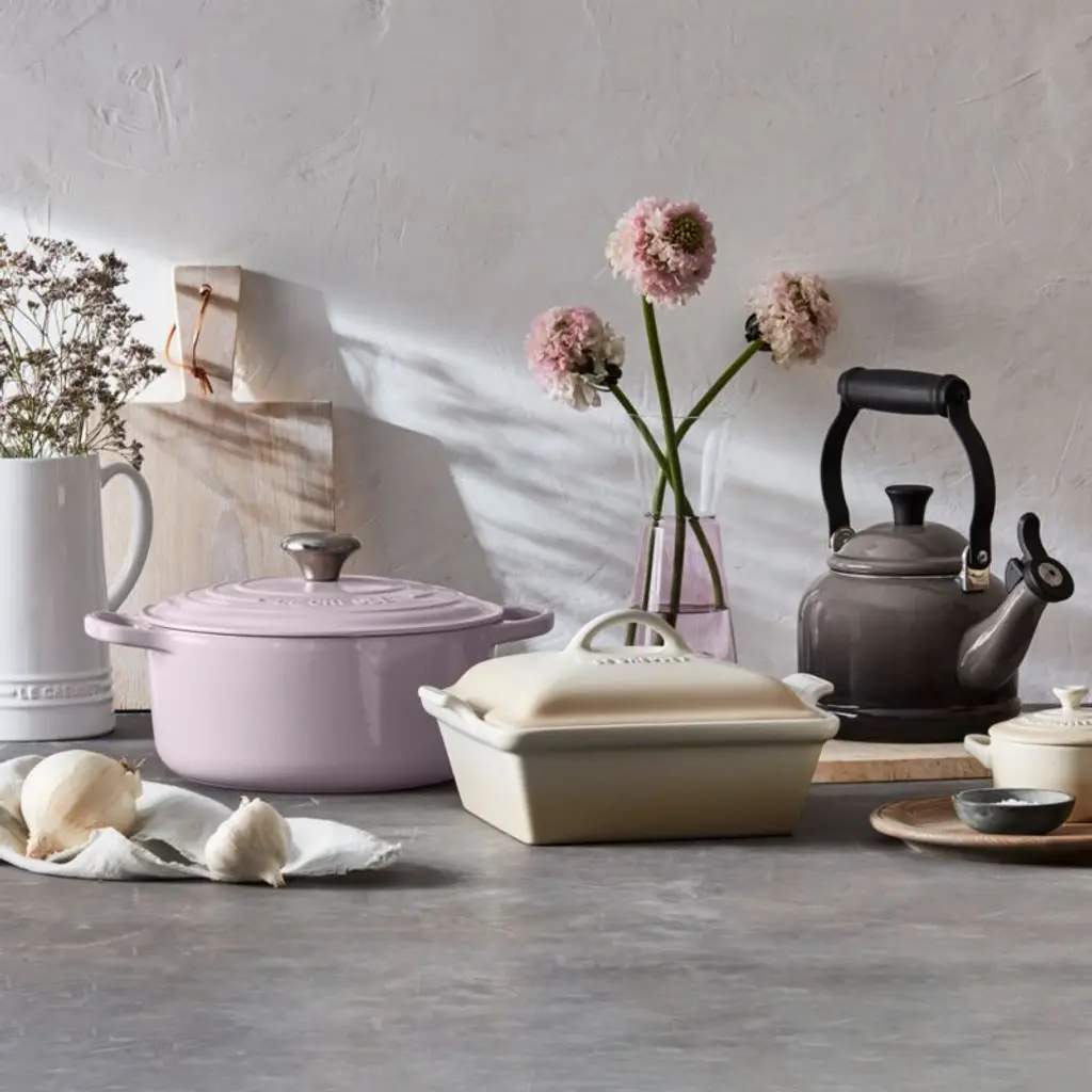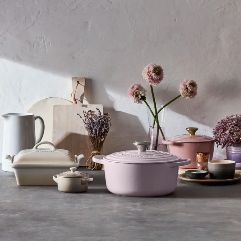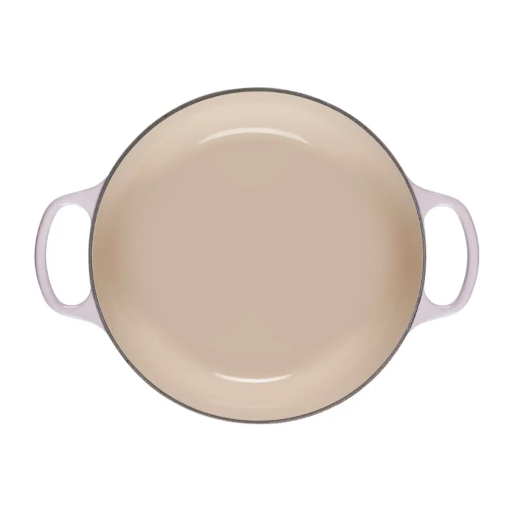 Enameled in creamy blush-purple inspired by shallots, this gorgeous cast iron oven is indispensable for slow-cooking, braising, searing, roasting or baking. The round pot maintains even and consistent heat and has a smooth interior that promotes caramelization, resists stains and prevents sticking for easy cleanup. Sized to cook seven to eight servings, the display-worthy Dutch oven is ideal for casual weeknight meals and elegant dinners. Use the lidded pan for whatever's on the menu, including posole, sourdough bread or a roast chicken.Revered by both professional chefs and home cooks since its 1925 debut, Le Creuset's classic French cookware is prized for its utilitarian beauty and unsurpassed heat retention.