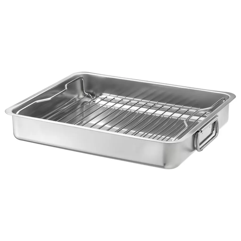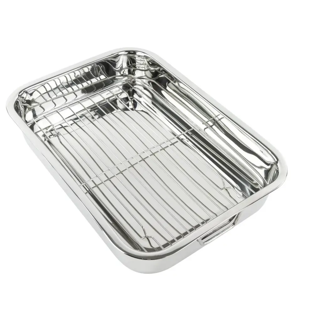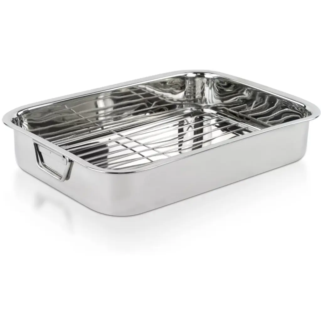 An essential piece of cookware for every family home, this stainless steel roasting pan with a roasting rack is perfect for the holidays or that Sunday roast. This classically designed roasting pan is perfect for holding turkeys, chickens, or a roast. This product is dishwasher safe, so cleaning up after your evening roast should not be a problem at all. A special feature of this product is that it has a removable shelf that allows food to drain, and has two durable handles that help with easy removal and carrying. The product is made from high quality stainless steel, so you know that your food will heat evenly. This is a great product for every home.