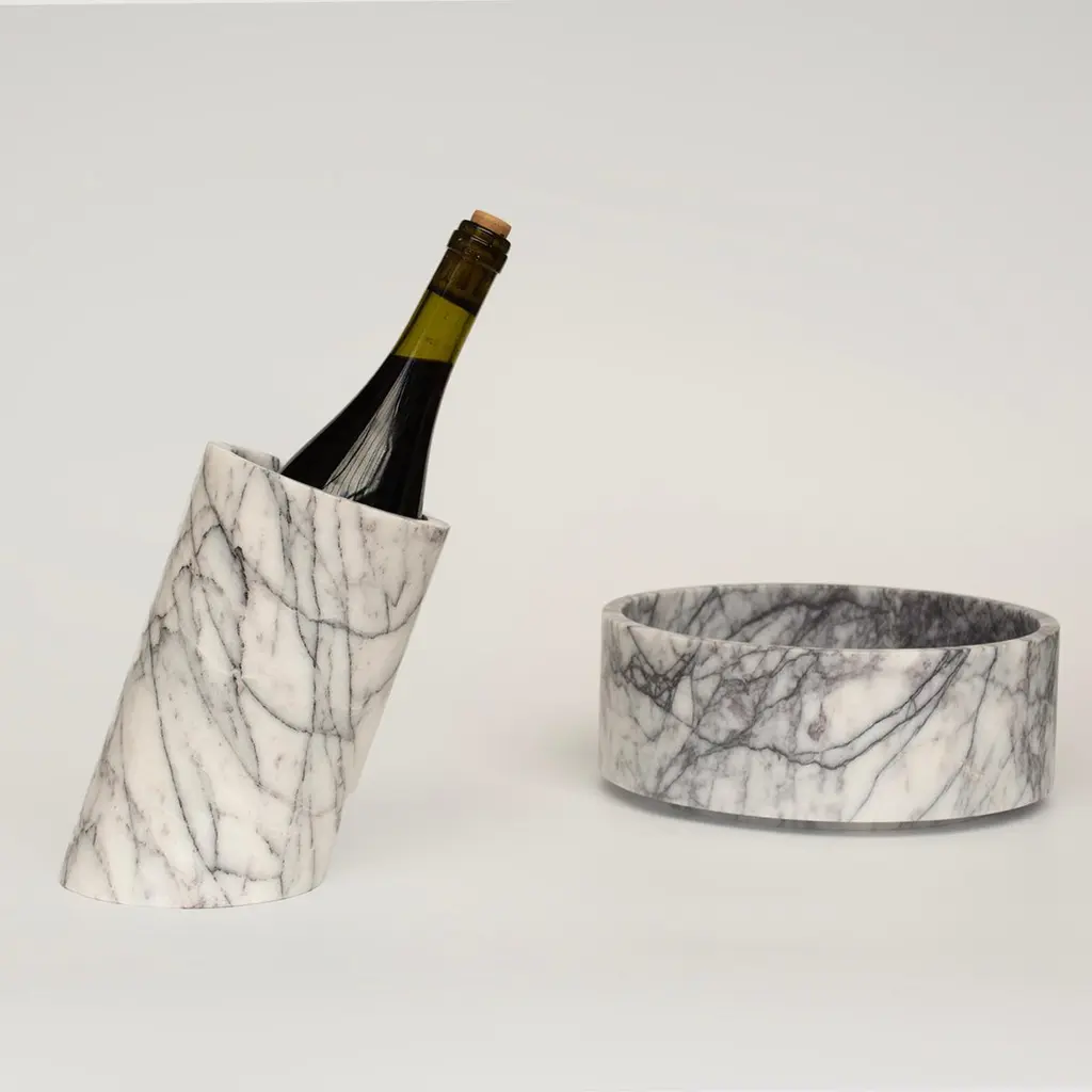 Our wine cooler is designed by us and hand crafted by the artisans within the fair-trade principles.The natural properties of the marble will keep your wine chilled with no need for ice - you can also place this marble cooler in the fridge for an colder temperature.There may be natural variations that are not product flaws, they make your design truly one-of-a-kind. Care: do not use any acid, clean with a gentle cloth and soap.