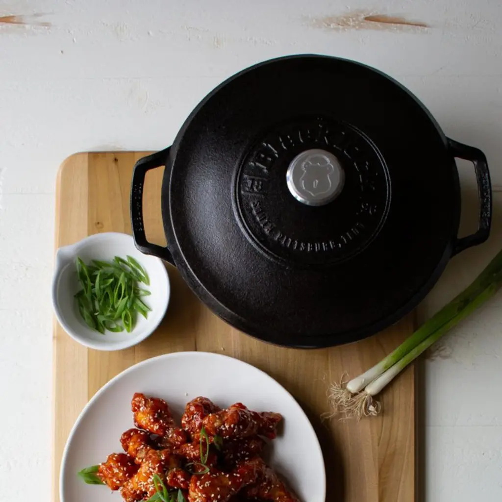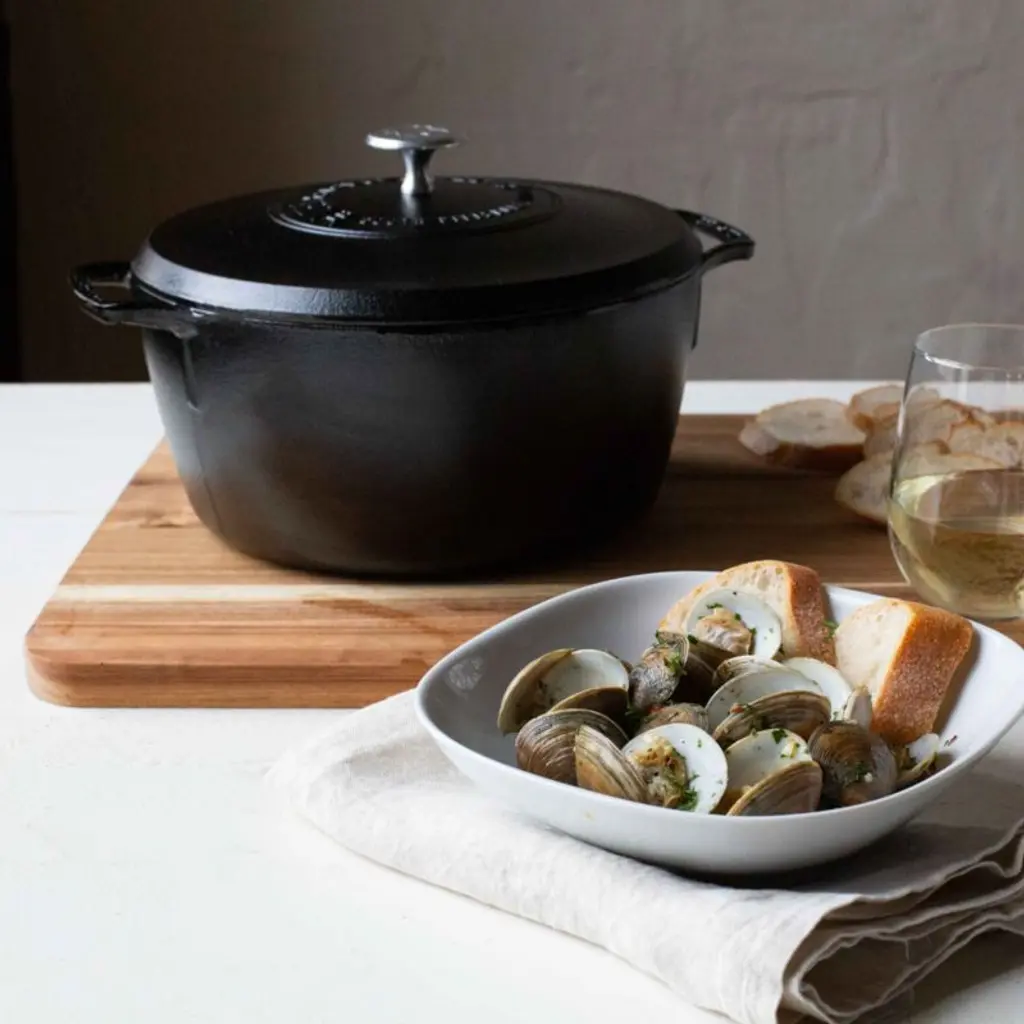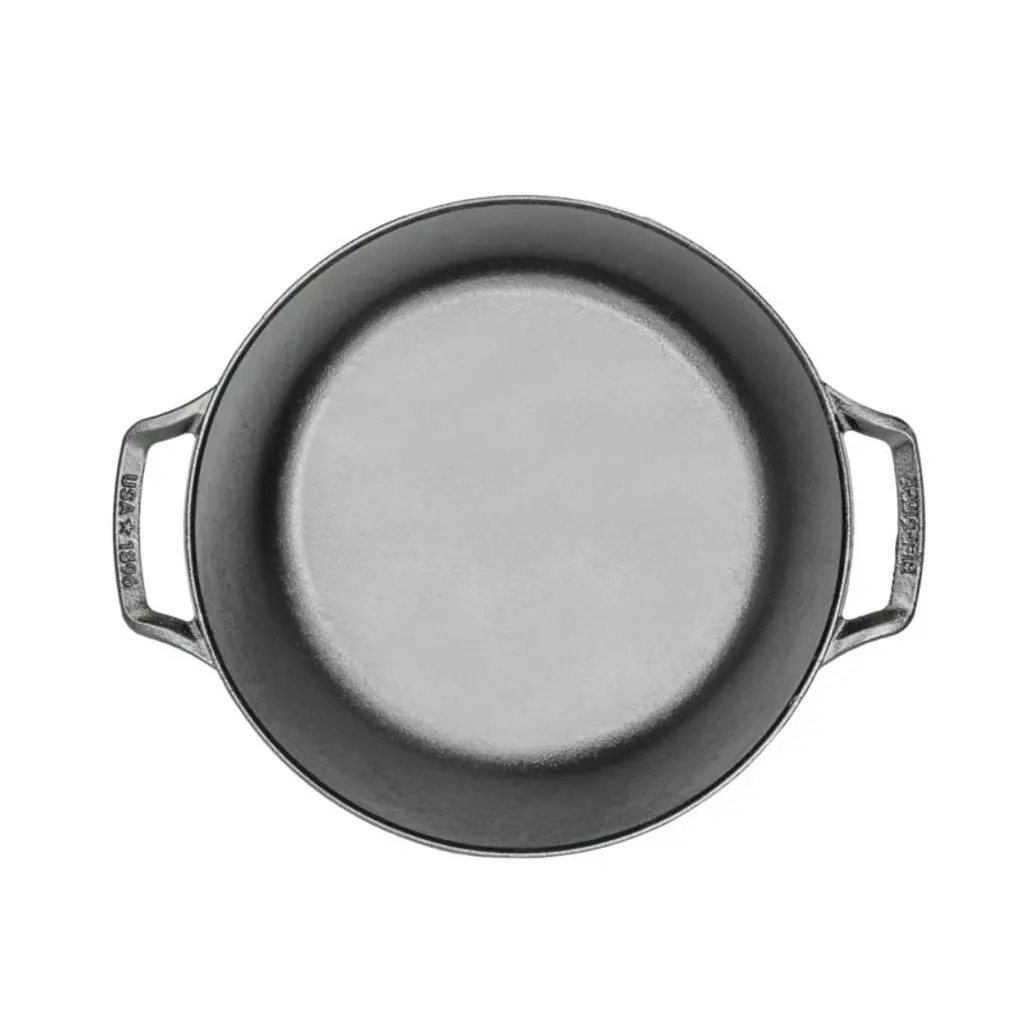 The Blacklock collection updates classic Lodge cast iron cookware for the modern kitchen. Lighter than traditional cast iron, this Dutch oven is triple-seasoned for a naturally non-stick finish. This secure lid topped with an aluminum knob locks in moisture and heat, and sloped side walls accommodate spatulas with ease. Elevated helper handles and an aluminum knob make the pan and lid easy to lift. Use the Dutch oven to roast chicken, bake bread and make soups.Each piece of Lodge cast iron cookware is backed by the company's over 125 years of experience.